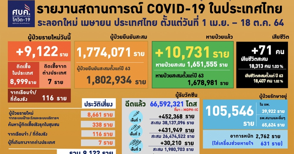 สำนักข่าวอิศรา (www.isranews.org) รายงานว่า เมื่อวันที่ 19 ต.ค.2564 ศูนย์บริหารสถานการณ์โควิด รายงานสถานการณ์ประจำวัน พบผู้ป่วยรายใหม่ 9,122 ราย ติดเชื้อในประเทศ 8,999 ราย มาจากระบบบริการ 8,661 ราย เกิดจากการตรวจคัดกรองเชิงรุก 338 ราย ติดเชื้อในเรือนจำ 116 ราย และอีก 7 รายเดินทางกลับจากต่างประเทศ ทำให้มีผู้ป่วยสะสมทั้งหมด 1,802,934 ราย ขณะที่มีผู้ติดเชื้อเข้าข่าย (ATK) 1,924 ราย