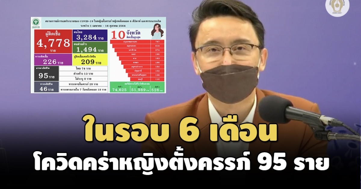สธ.เผยในรอบ 6 เดือน โควิดคร่าชีวิตหญิงตั้งครรภ์แล้ว 95 ราย และทารก 46 ราย ห่วงเกินครึ่งยังไม่ได้ฉีดวัคซีน เสี่ยงติดเชื้อ 2 ใน 3 กังวลความปลอดภัย-ประสิทธิภาพวัคซีน เร่งรณรงค์กว่า 2 แสนคนฉีด ให้ได้ตามเป้า ยันวัคซีนปลอดภัย มีประโยชน์มากกว่าโทษ