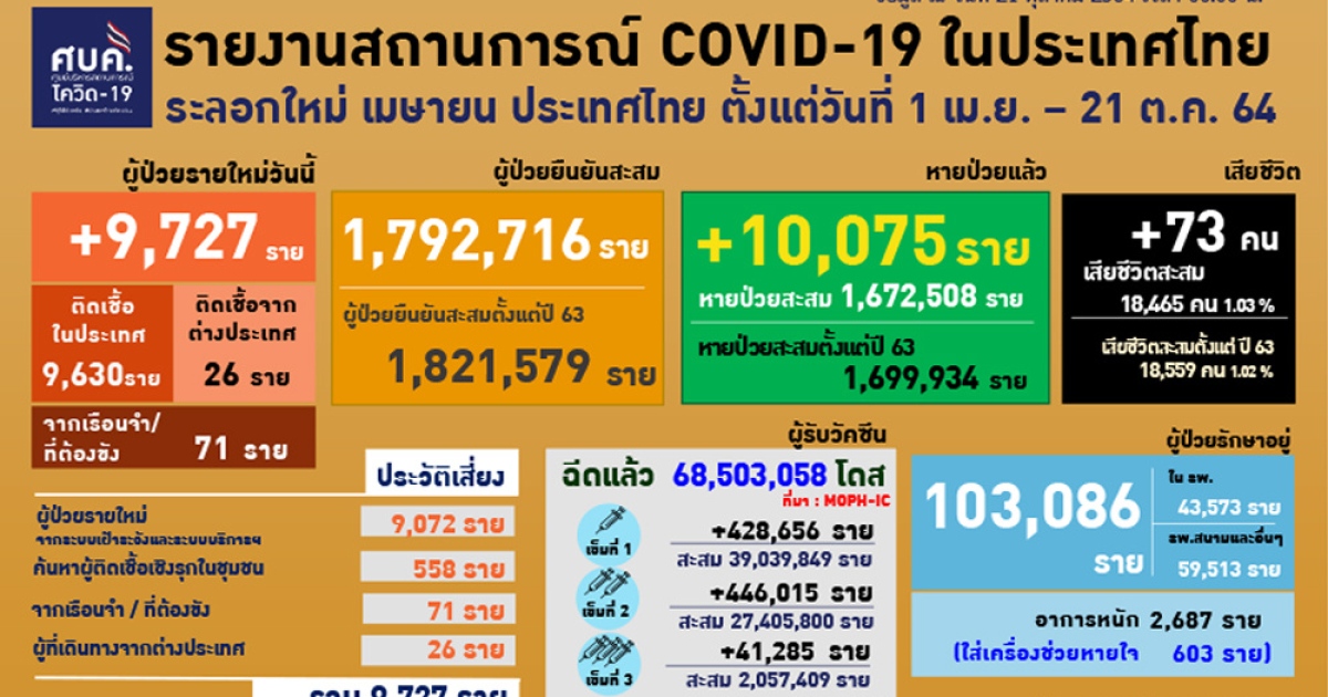 สำนักข่าวอิศรา (www.isranews.org) รายงานว่า เมื่อวันที่ 21 ต.ค.2564 ศูนย์บริหารสถานการณ์โควิด (ศบค.) รายงานสถานการณ์ประจำวัน พบผู้ป่วยรายใหม่ 9,727 ราย ติดเชื้อในประเทศ 9,630 ราย มาจากระบบบริการ 9,072 ราย เกิดจากการตรวจคัดกรองเชิงรุก 558 ราย ติดเชื้อในเรือนจำ 71 ราย และอีก 26 รายเดินทางกลับจากต่างประเทศ ทำให้มีผู้ป่วยสะสมทั้งหมด 1,821,579 ราย และมีผู้ติดเชื้อเข้าข่าย (ATK) 2,059 ราย รวมยอดผลบวกสะสมตั้งแต่วันที่ 20 ส.ค.2564 จำนวน 176,086 ราย