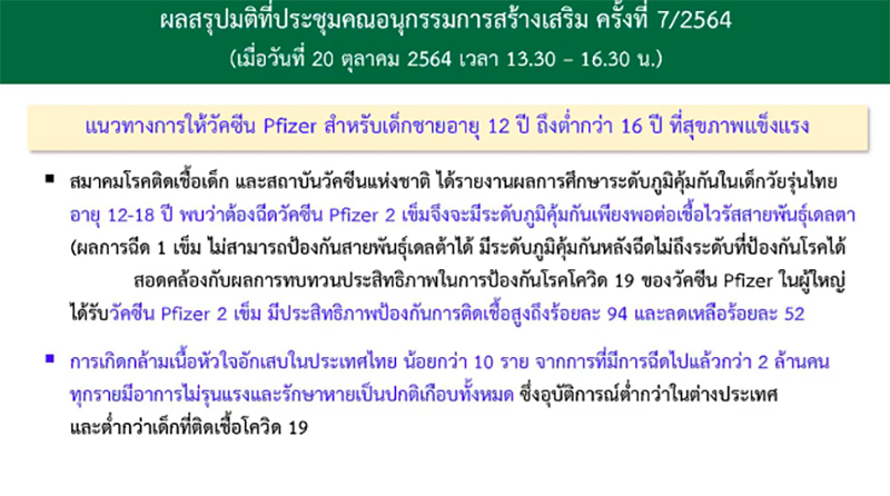 นพ.โอภาส กล่าวถึงมติที่ประชุมคณะอนุกรรมการสร้างเสริม ครั้งที่ 7/2564 เมื่อวันที่ 20 ต.ค.ที่ผ่านมาว่า ที่ประชุมได้มีมติให้ฉีดวัคซีนไฟเซอร์เข็ม 2 สำหรับเด็กชายอายุ 12-16 ปี ตามความสมัครใจของเด็กและผู้ปกครอง โดยคณะผู้เชี่ยวชาญ สมาคมโรคติดเชื้อและสถาบันวัคซีนแห่งชาติรายงานผลการศึกษาระดับภูมิคุ้มกันในวัยรุ่นอายุ 12-18 ปี พบว่า ต้องฉีดวัคซีนไฟเซอร์ 2 เข็มจึงจะมีระดับภูมิคุ้มกันเพียงพอต่อโควิดสายพันธุ์เดลต้า ซึ่งผลการฉีดเข็ม 1 ไม่สามารถป้องกันสายพันธุ์เดลต้าได้ เพราะมีระดับภูมิคุ้มกันหลังฉีดไม่ถึงเพียงพอที่จะป้องกันโรคได้