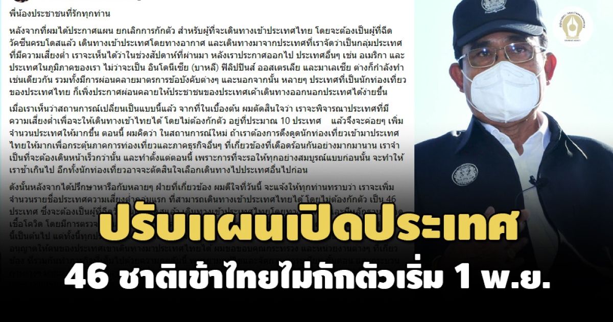 นายกรัฐมนตรี กล่าวย้ำว่า หลังจากได้ปรึกษาหารือกับหลายๆ ฝ่ายที่เกี่ยวข้อง ตนดีใจที่วันนี้จะแจ้งให้ทุกท่านทราบว่า เราจะเพิ่มจำนวนรายชื่อประเทศความเสี่ยงต่ำกลุ่มแรกที่สามารถเดินทางเข้าประเทศไทยได้ โดยไม่ต้องกักตัวเป็น 46 ประเทศ ซึ่งจะต้องเป็นผู้ที่ฉีดวัคซีนครบโดสแล้ว เดินทางเข้าประเทศไทยโดยทางอากาศ และมีหลักฐานปลอดเชื้อโควิด โดยมีการตรวจก่อนออกเดินทาง และตรวจเมื่อมาถึงประเทศไทย ซึ่งจะมีผลตั้งแต่วันที่ 1 พฤศจิกายนนี้เป็นต้นไป ทั้งนี้ทุกประเทศดังกล่าวคงต้องพิจารณาความเสี่ยงของประเทศไทยด้วยเช่นกัน ก่อนที่จะอนุญาตให้คนของประเทศเขาเดินทางมาประเทศไทยได้