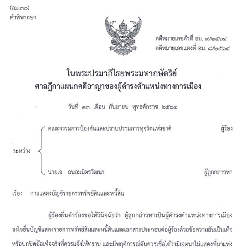 สำนักข่าวอิศรา (www.isranews.org) รายางานว่าเมื่อวันที่ 13 กันยายน 2564 ศาลฎีกาแผนกคดีอาญาของผู้ดำรงตำแหน่งทางการเมือง มีคำพิพากษาว่า นายเอ ถนอมมิตรวัฒนา สมาชิกสภาองค์การบริหารส่วนจังหวัดอุทัยธานี ผู้ถูกกล่าวหา จงใจยื่นบัญชีแสดงรายการ ทรัพย์สินและหนี้สินและเอกสารประกอบต่อคณะกรรมการ ป.ป.ช. ด้วยข้อความอันเป็นเท็จหรือ ปกปิดข้อเท็จจริงที่ควรแจ้งให้ทราบ กรณีพ้นจากตําแหน่ง ตามคําพิพากษาดังกล่าวเมื่อวันที่ 20 ตุลาคม 2560 โดยแสดงและไม่แสดงรายการทรัพย์สินและหนี้สินของผู้ถูกกล่าวหาและคู่สมรสหลายรายการ ดังนี้ แสดงรายการ ทรัพย์สินที่ดินจํานวน 48 แปลง ที่ผู้ถูกกล่าวหาได้มาในระหว่างดํารงตําแหน่งต่ำกว่ามูลค่าที่ได้มา ที่แท้จริง รวมเป็นเงิน 66,841,300 บาท แสดงรายการหนี้สินที่มีหลักฐานเป็นหนังสืออันเป็นเท็จ จํานวน 22 สัญญา รวมเป็นเงิน 42,060,000 บาท ไม่แสดงรายการโรงเรือนและสิ่งปลูกสร้าง บนที่ดินทรัพย์สินพระมหากษัตริย์ จํานวน 4 แปลง มูลค่ารวม 72,300,000 บาท และไม่แสดง รายการหนี้สินเงินกู้ธนาคารหรือสถาบันการเงินอื่น จํานวน 1 รายการ เป็นเงิน 8,000,000 บาท ห้ามมิให้ดํารงตําแหน่งทางการเมืองหรือดํารงตําแหน่งใดในพรรคการเมืองเป็นเวลาห้าปีนับแต่วันที่ 21 กันยายน 2560 ซึ่งเป็นวันที่พ้นจากตําแหน่ง กับมีความผิดตามพระราชบัญญัติประกอบรัฐธรรมนูญว่าด้วยการป้องกันและปราบปรามการทุจริต พ.ศ. 2542 มาตรา 119 จําคุก 2 เดือน และปรับ 8,000 บาท ผู้ถูกกล่าวหาให้การรับสารภาพ เป็นประโยชน์แก่การพิจารณา มีเหตุบรรเทาโทษ ลดโทษให้กึ่งหนึ่ง ตามประมวลกฎหมายอาญา มาตรา 78 คงจําคุก 1 เดือน และปรับ 4,000 บาท ไม่ปรากฏว่าผู้ถูกกล่าวหาเคยได้รับโทษจําคุกมาก่อน ประกอบกับเป็นโทษจําคุกระยะสั้นเห็นสมควรให้โอกาสแก่ผู้ถูกกล่าวหาอีกสักครั้ง โทษจําคุกจึงให้รอการลงโทษไว้มีกําหนด 1 ปี รายละเอียดดังนี้