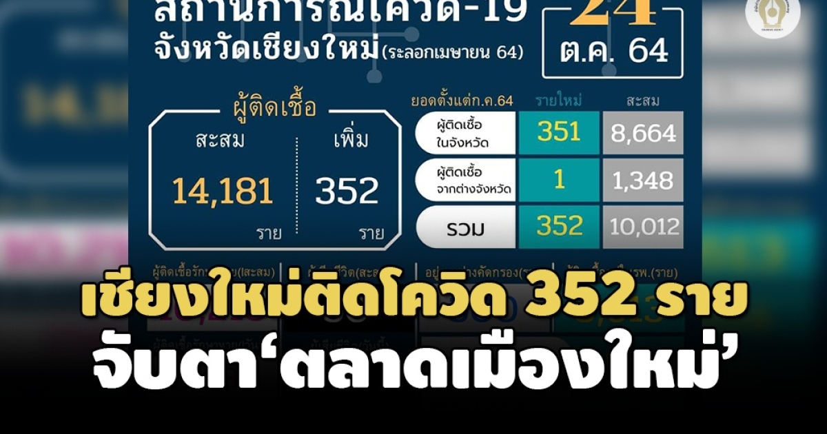 เชียงใหม่พบผู้ติดเชื้อรายใหม่ 352 ราย มาจากคลัสเตอร์ตลาดประตูเชียงใหม่เพิ่ม 43 ราย เตรียมนำแนวทาง 'ตลาดวโรรส' มาใช้ควบคุมโรค ด้านคลัสเตอร์ตลาดเมืองใหม่ ยังต้องเฝ้าระวังอย่างต่อเนื่อง หลังพบมีการแพร่กระจายไปยังชุมชนแรงงานต่างด้าวที่อยู่ใกล้เคียง