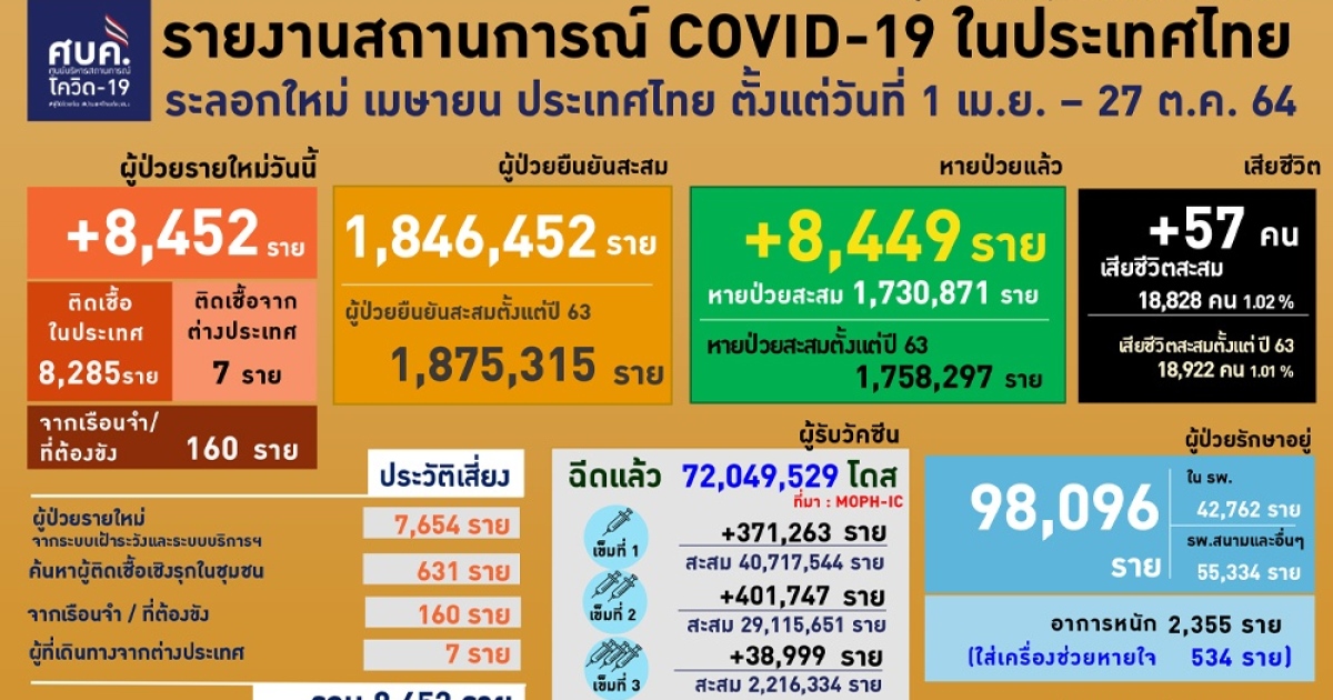 สำนักข่าวอิศรา (www.isranews.org) รายงานว่า เมื่อวันที่ 27 ต.ค.2564 พญ.สุมนี วัชรสินธุ์ ผู้อำนวยการสำนักสื่อสารความเสี่ยงและการพัฒนาพฤติกรรมสุขภาพ กรมควบคุมโรค กระทรวงสาธารณสุข รายงานสถานการณ์ประจำวัน พบผู้ป่วยรายใหม่ 8,452 ราย ติดเชื้อในประเทศ 8,285 ราย มาจากระบบบริการ 7,654 ราย เกิดจากการตรวจคัดกรองเชิงรุก 631 ราย ติดเชื้อในเรือนจำ 160 ราย และอีก 7 รายเดินทางกลับจากต่างประเทศ ทำให้มีผู้ป่วยสะสมทั้งหมด 1,875,315 ราย และมีผู้ติดเชื้อเข้าข่าย (ATK) จำนวน 1,394 ราย คิดเป็น 3.62%