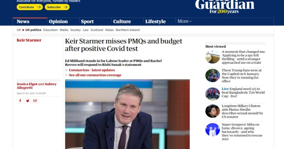 สำนักข่าวอิศรา (www.isranews.org) รายงานสถานการณ์อันเกี่ยวกับการแพร่ระบาดของไวรัสโควิด-19 หรือโคโรน่าไวรัสว่า ทางพรรคแรงงานประเทศอังกฤษ ซึ่งทำหน้าที่เป็นพรรคฝ่ายค้านในรัฐสภาได้ออกแถลงการณ์ว่านายเคียร์ สตาร์เมอร์ หัวหน้าพรรคถูกตรวจพบว่ามีผลตรวจโควิด-19 เป็นบวก และจะไม่ได้เข้าร่วมการอภิปราบงบประมาณที่รัฐสภาในวันนี้ และ ณ เวลานี้มีการคาดการณ์ว่านางราเชล รีฟ นายกรัฐมนตรีเงาจะได้เป็นผู้อภิปรายแทน