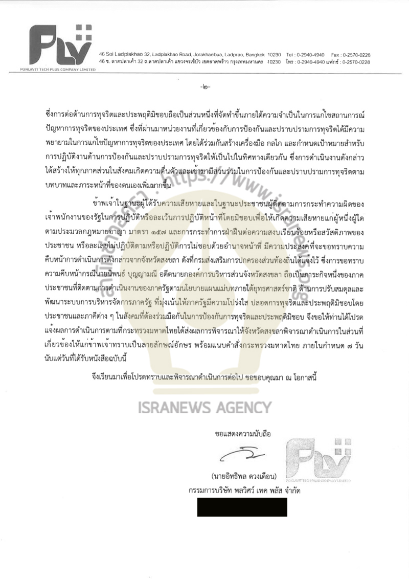 โดยรายละเอียดหนังสือซึ่งมีการลงนามโดยนายอิทธิพล ดวงเดือน กรรมการบริษัทพลวิศว์ เทคพลัสมีรายละเอียดดังต่อไปนี้