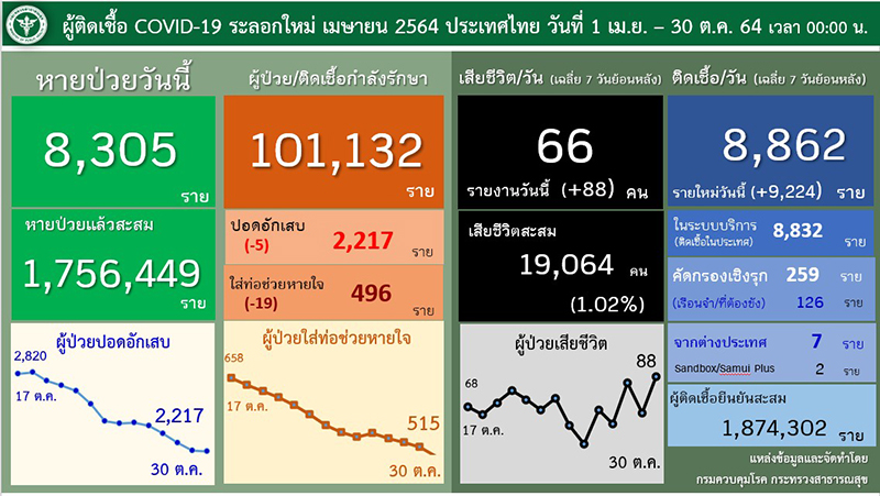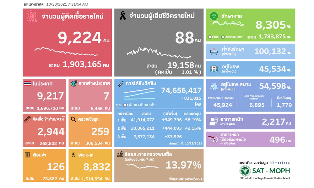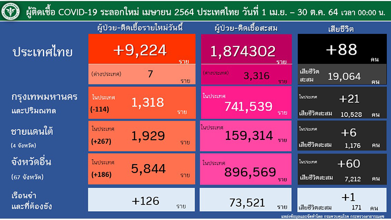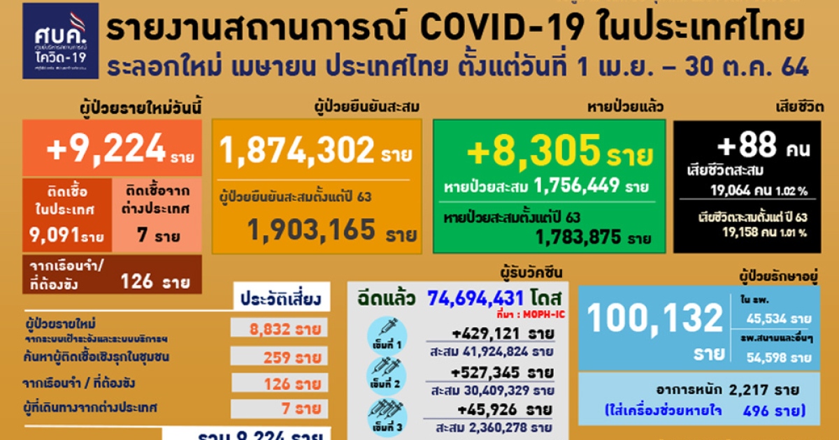 สำนักข่าวอิศรา (www.isranews.org) รายงานว่า เมื่อวันที่ 30 ต.ค. 2564 ศูนย์บริหารสถานการณ์โควิด (ศบค.) รายงานสถานการณ์ประจำวัน โดยพบผู้ป่วยรายใหม่ 9,224 ราย จำแนกเป็น ติดเชื้อในประเทศ 9,091 ราย เกิดจากระบบเฝ้าระวังและระบบบริการฯ 8,832 ราย เกิดจากการค้นหาเชิงรุกและพบการติดเชื้อในชุมชน 259 ราย ติดเชื้อภายในเรือนจำ 126 ราย อีก 7 รายเดินทางกลับมาจากต่างประเทศ รวมผู้ป่วยสะสม 1,903,165 ราย