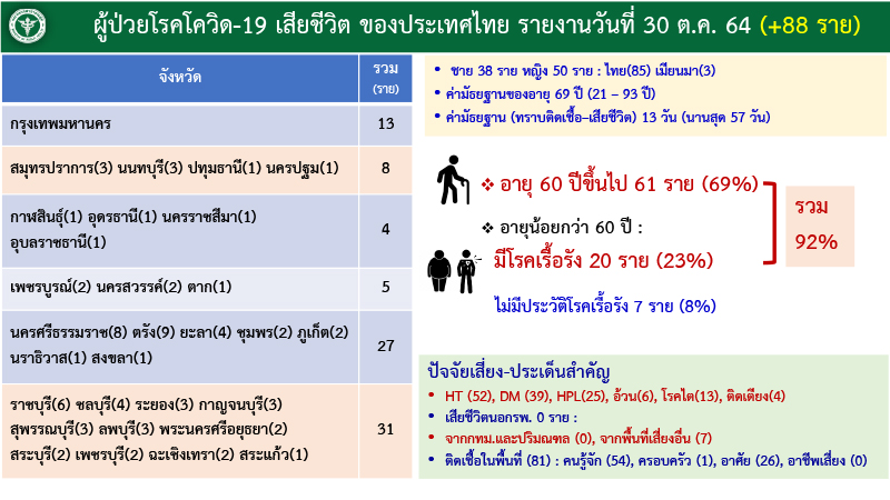 สำหรับผู้เสียชีวิต 88 ราย มาจาก กทม.และปริมณฑล 21 ราย ภาคใต้ 27 ราย และจังหวัดอื่นๆ 40 ราย อายุเฉลี่ย 69 ปี ทั้งหมดนี้เป็นผู้สูงอายุ และ กลุ่มโรคเรื้อรัง 92%