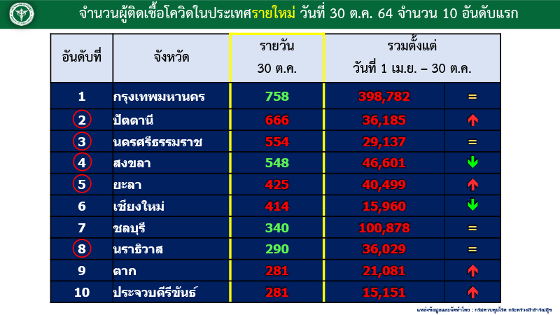 โดย 10 จังหวัดที่มีผู้ติดเชื้อโควิดรายใหม่สูงสุด ตามลำดับ ได้แก่ กทม. 758 ราย ปัตตานี 666 ราย นครศรีธรรมราช 554 ราย สงขลา 548 ราย ยะลา 425 ราย เชียงใหม่ 414 ราย ชลบุรี 340 ราย นราธิวาส 290 ราย ตาก 281 ราย และประจวบคีรีขันธ์ 281 ราย