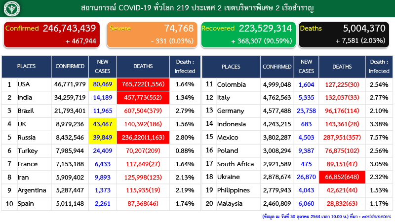 ขณะที่สถานการณ์ทั่วโลกพบผู้ป่วยเพิ่ม 467,944 ราย รวม 246,743,439 ราย อาการหนัก 74,768 ราย หายป่วย 223,529,314 ราย เสียชีวิต 5,004,370 ราย โดยสหรัฐอเมริกาพบผู้ป่วยเพิ่ม 80,469 ราย รวม 46,771,979 ราย เสียชีวิตเพิ่ม 1,556 ราย รวม 765,722 ราย อินเดีย พบเพิ่ม 14,189 ราย รวม 34,259,719 ราย เสียชีวิตเพิ่ม 522 ราย รวม 457,773 ราย บราซิล พบเพิ่ม 11,965 ราย รวม 21,793,401 ราย เสียชีวิตเพิ่ม 379 ราย รวม 607,504 ราย ส่วนไทยอยู่ในอันดับที่ 24 ของโลก