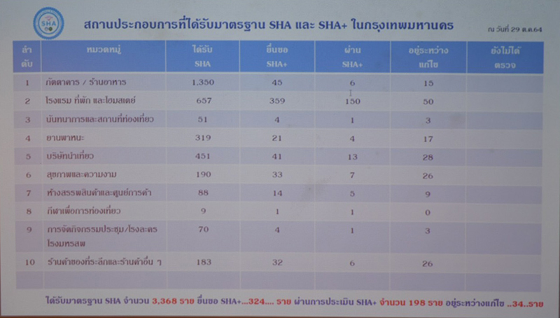 นอกจากนี้ ตามคณะกรรมการโรคติดต่อกรุงเทพมหานคร ได้ร่วมกันพิจารณาและมีความห่วงใยในการเปิดให้บริการดื่มเครื่องดื่มแอลกอฮอล์ในร้านอาหาร และเพื่อเป็นการสร้างความเชื่อมั่นให้แก่นักท่องเที่ยวและประชาชน จึงขอให้ผู้ประกอบการร้านจำหน่ายอาหารหรือเครื่องดื่มดำเนินการปรับปรุงสถานประกอบการให้สอดคล้องกับวิถีชีวิตใหม่ เพื่อยกระดับมาตรฐานอุตสาหกรรมท่องเที่ยว และเข้ารับการตรวจประเมินความพร้อมมาตรฐานความปลอดภัยด้านสุขอนามัย SHA โดยลงทะเบียนผ่านทางเว็บไซต์ www.thailandsha.com รวมทั้งเคร่งครัดช่วงเวลาการให้บริการให้อยู่ภายในเวลา 21.00 น. ตามที่กำหนด