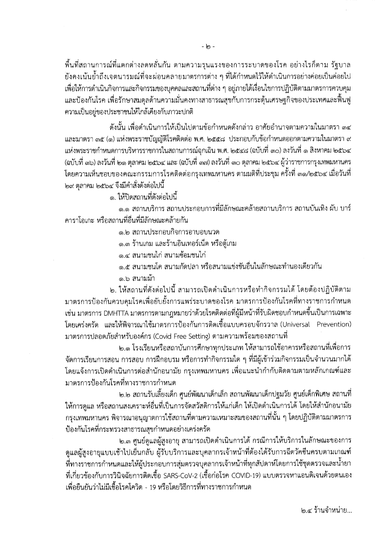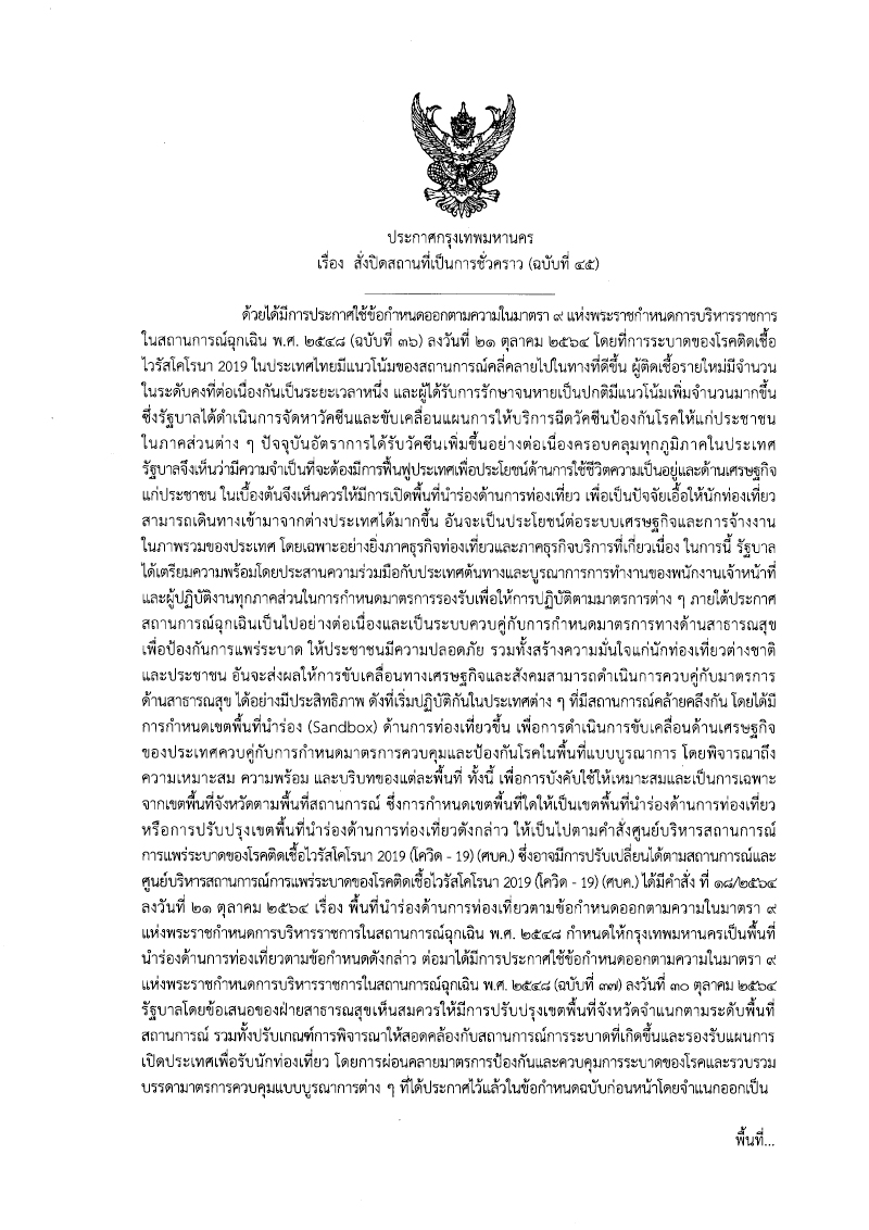 ผู้สื่อข่าวรายงานว่า เมื่อวันที่ 30 ตุลาคม 2564 พลตำรวจเอกอัศวิน ขวัญเมือง ผู้ว่าราชการกรุงเทพมหานคร เป็นประธานการประชุมคณะกรรมการโรคติดต่อกรุงเทพมหานคร ครั้งที่ 31/2564 โดยที่ประชุมได้มีมติเห็นชอบประกาศกรุงเทพมหานคร เรื่อง สั่งปิดสถานที่เป็นการชั่วคราว (ฉบับที่ 45) ตามที่ศูนย์บริหารสถานการณ์โควิด (ศบค.) มีคำสั่งกำหนดให้กรุงเทพมหานครเป็นพื้นที่นำร่องด้านการท่องเที่ยว และกำหนดมาตรการควบคุมแบบบูรณาการในพื้นที่นำร่องด้านการท่องเที่ยวเพิ่มเติม คณะกรรมการฯ เห็นชอบให้มีมาตรการผ่อนคลายสถานที่ให้สามารถเปิดดำเนินการหรือทำกิจกรรมบางอย่างได้ โดยต้องปฏิบัติตามมาตรการป้องกันโรคที่ทางราชการกำหนด และมาตรการป้องกันการติดเชื้อแบบครอบจักรวาล (Universal Prevention) โดยเคร่งครัด รวมทั้งต้องมีมาตรการปลอดภัยสำหรับองค์กร (Covid Free Setting) โดยมีผลตั้งแต่ 1-30 พฤศจิกายน หรือจนกว่าจะมีประกาศเปลี่ยนแปลง