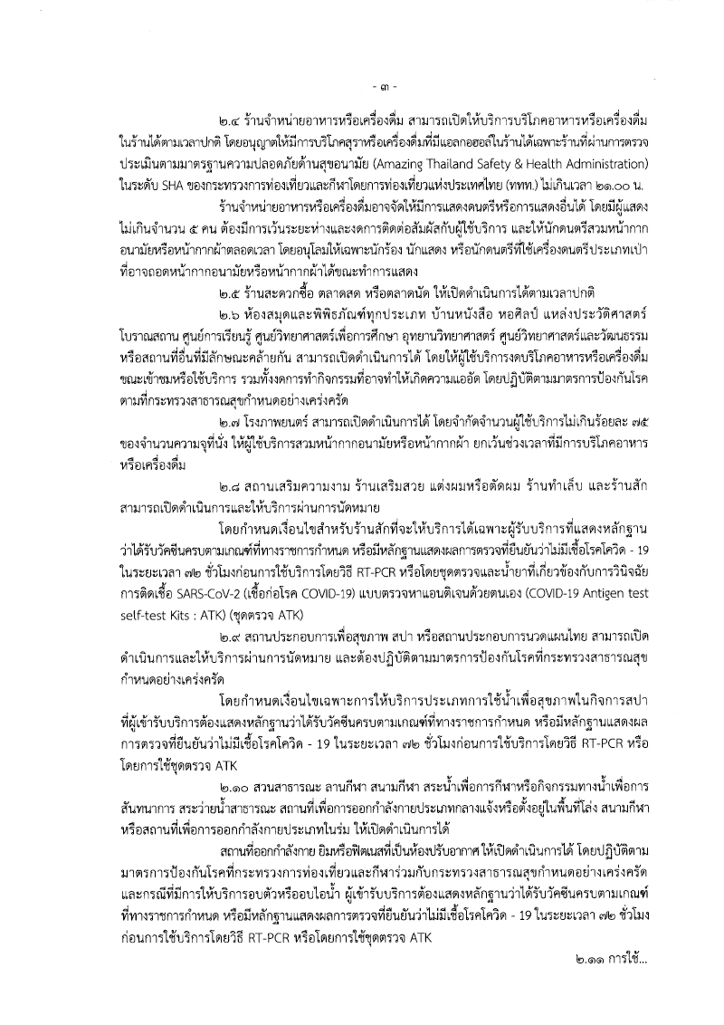สถานประกอบกิจการอาบน้ำ อบไอน้ำ อบสมุนไพร ผู้รับบริการต้องได้รับวัคซีนครบ หรือมีผลตรวจ RT-PCR หรือผล ATK ในระยะเวลา 72 ชม.