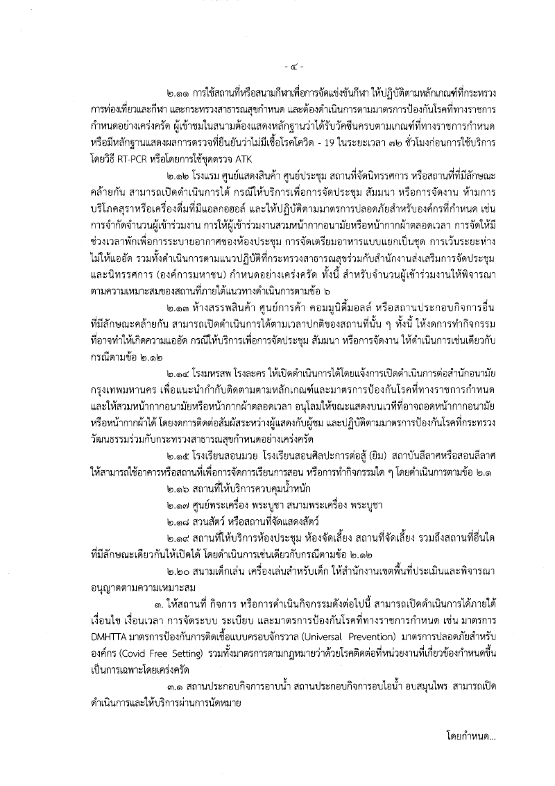 ยิม ฟิตเนส ปฏิบัติตามมาตรการป้องกันโรคโดยเคร่งครัด หากมีการอบตัวหรืออบไอน้ำ ผู้รับบริการต้องได้รับวัคซีนครบ หรือมีผลตรวจ RT-PCR หรือผล ATK ในระยะเวลา 72 ชม.