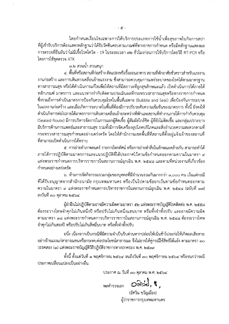 สปา นวดแผนไทย ให้บริการเฉพาะนัดหมาย เฉพาะการให้บริการประเภทใช้น้ำ ผู้รับบริการต้องได้รับวัคซีนครบ หรือมีผลตรวจ RT-PCR หรือผล ATK ในระยะเวลา 72 ชม.