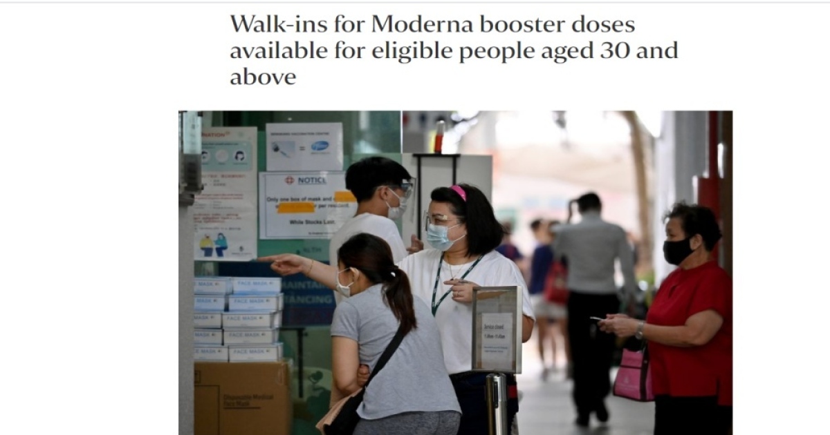 สำนักข่าวอิศรา (www.isranews.org) รายงานสถานการณ์การระบาดของไวรัสโควิด-19 ว่าที่ประเทศสิงคโปร์ กระทรวงสาธารณสุขได้ประกาศว่าบุคคลที่มีอายุตั้งแต่ 30 ปีขึ้นไปสามารถเดินวอล์กอินเข้ารับการฉีดวัคซีนโมเดอร์นาเพื่อใช้เป็นเข็มบูสเตอร์ได้ที่ศูนย์ฉีดทั่วประเทศนับตั้งแต่วันที่ 1 พ.ย.เป็นต้นไป