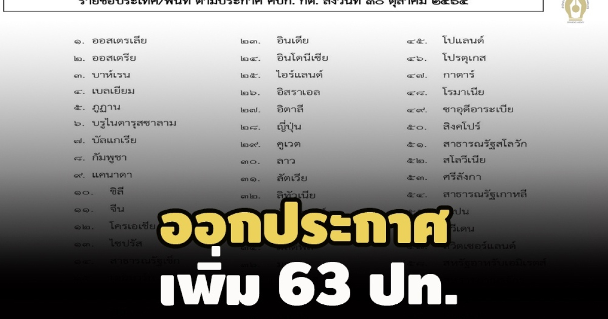 ปลัดกระทรวงการต่างประเทศ ในฐานะหัวหน้า ศปก.กต. จึงประกาศรายชื่อประเทศและพื้นที่ต้นทางสำหรับบุคคลประเภท (13) ที่ผู้เดินทางจากประเทศและพื้นที่ดังกล่าวได้รับอนุญาตให้เดินทางเข้ามาในราชอาณาจักร จำนวน 63 ประเทศดังกล่าว (ดูประกาศประกอบ)