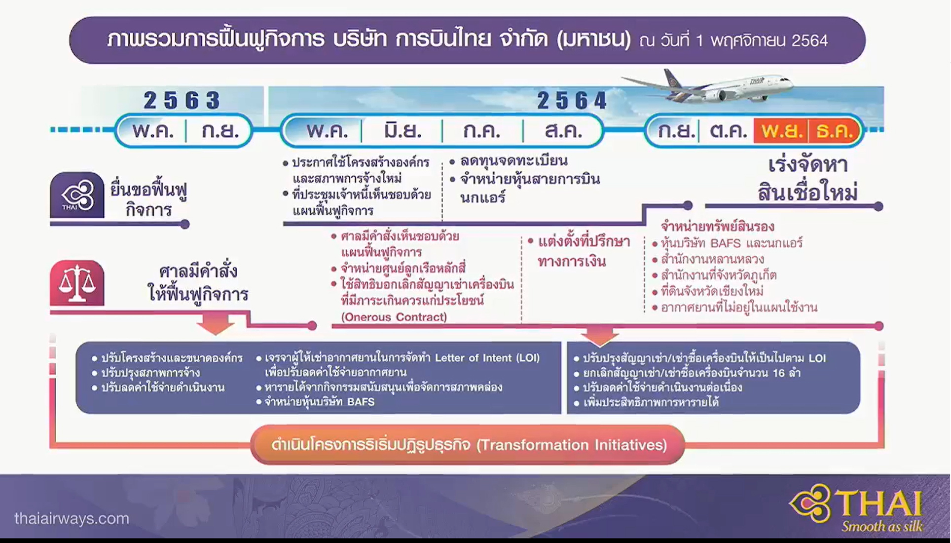 อย่างไรก็ตาม แม้ว่าในช่วง 6 เดือนแรกของปี 2564 บริษัทฯ ยังมีผลขาดทุนจากการดำเนินงาน แต่ขาดทุนลดลงจากช่วงเวลาเดียวกันของปี 2563 เป็นเงิน 3,973 ล้านบาท เมื่อรวมรายการครั้งเดียวทางบัญชี ทำให้บริษัทฯ มีกำไรสุทธิ 11,121 ล้านบาท ดีขึ้นกว่าช่วงเดียวกันของปี 2563 เป็นเงิน 39,151 ล้านบาท ขณะที่ผู้บริหารแผนฯสามารถดำเนินการตามแผนฟื้นฟูกิจการ แผนปฏิรูปธุรกิจ และบริหารจัดการสภาพคล่องอย่างมีประสิทธิภาพ ทำให้ให้บริษัทฯ มีกระแสเงินสดสำหรับการดำเนินธุรกิจอย่างเพียงพอต่อเนื่องตั้งแต่เดือน มิ.ย.2564 เป็นต้นมา