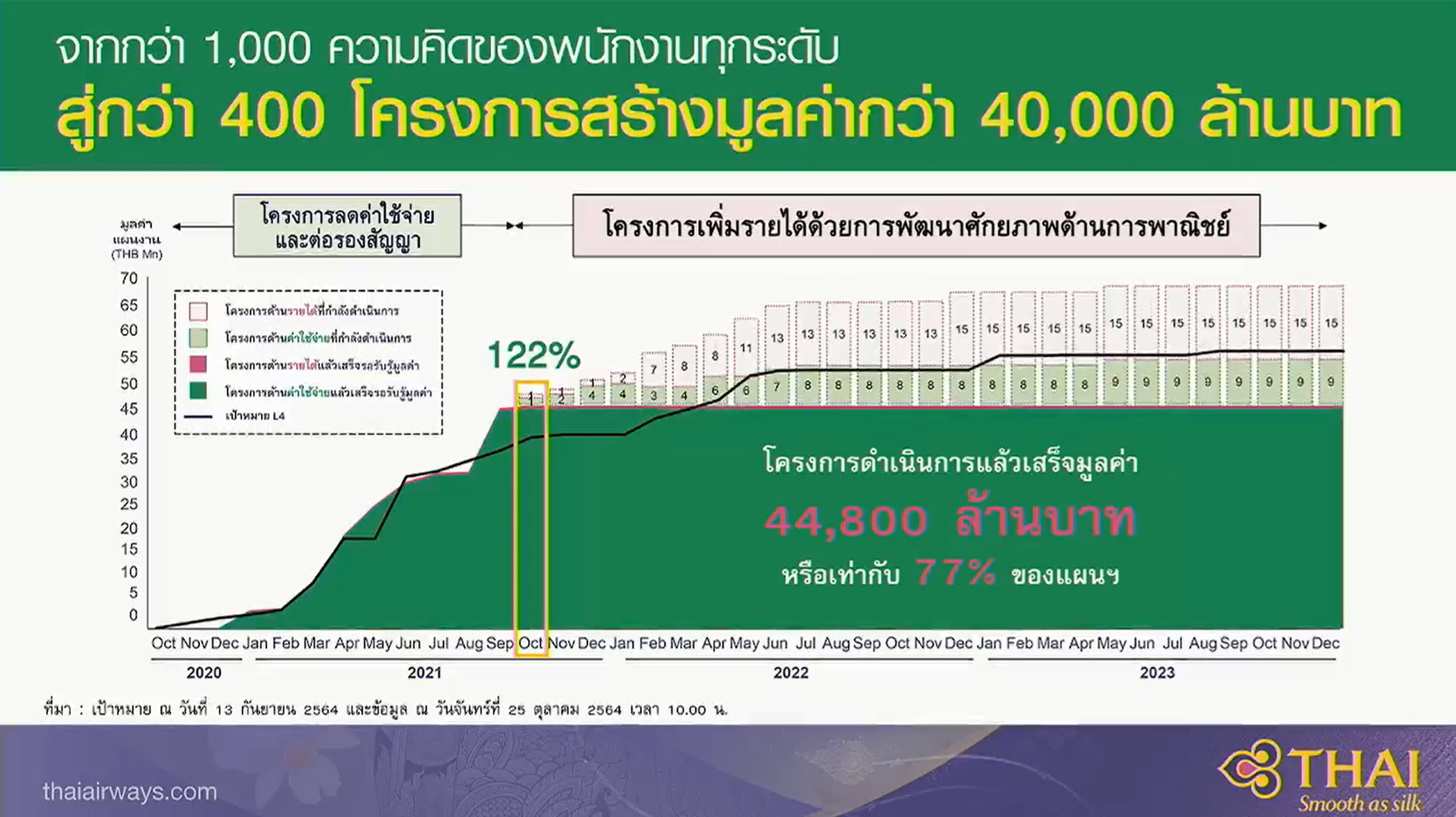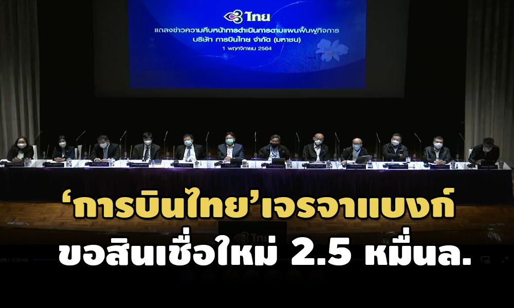 ‘การบินไทย’ เจรจา ‘สถาบันการเงิน’ ขอสินเชื่อใหม่ 2.5 หมื่นล้าน ยก 4 เหตุผลจูงใจปล่อยกู้ คาดได้ข้อสรุปไม่เกิน ม.ค.2565 หวังภาครัฐตัดสินใจหนุนเงินใหม่อีก 2.5 หมื่นล้าน เผยหลังเดินหน้า ‘ปฏิรูปธุรกิจ’ ลดต้นทุนได้ 4.48 หมื่นล้านบาท