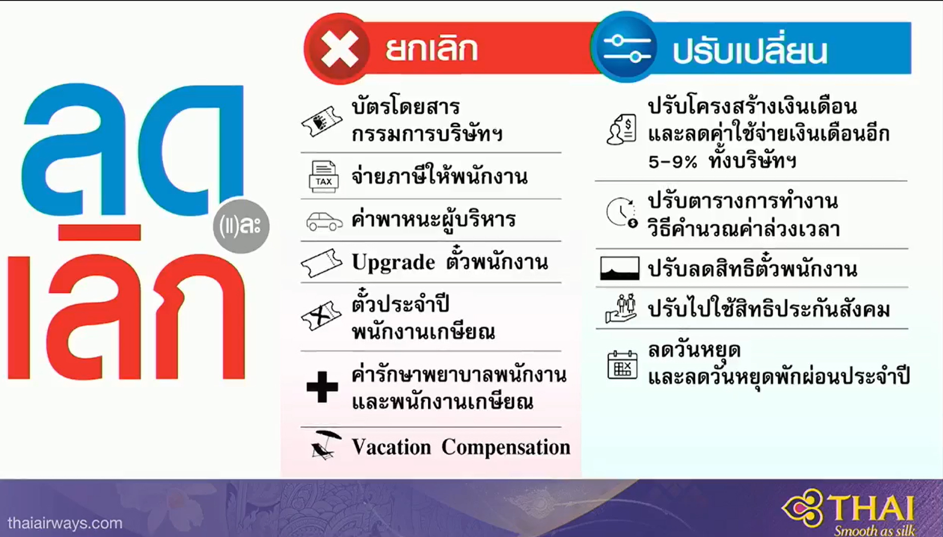 กำหนด (Vacation Compensation) ปรับเปลี่ยนโครงสร้างค่าตอบแทนรวมถึงหลักเกณฑ์การคำนวณค่าทำงานล่วงเวลา ลดสิทธิบัตรโดยสารพนักงาน เป็นต้น