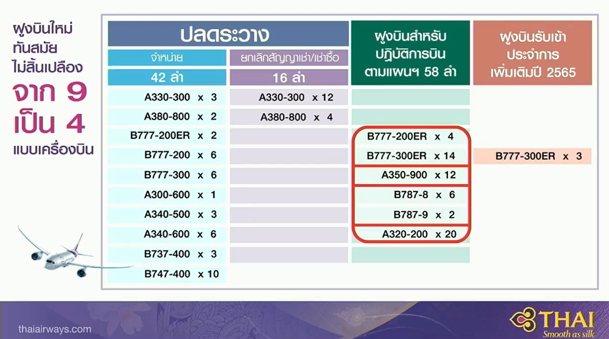 นอกจากนี้ บริษัทฯ มีแผนปลดระวางเครื่องบินที่มีอายุการใช้งานมาเป็นระยะเวลานาน มีอัตราการสิ้นเปลืองน้ำมันเชื้อเพลิงสูงเพื่อจำหน่ายจำนวน 42 ลำ ยกเลิกสัญญาเช่าและเช่าซื้อจำนวน 16 ลำ จะทำให้บริษัทฯ มีฝูงบินรวม 58 ลำ โดยรวมถึงฝูงบิน A320 ซึ่งสายการบินไทยสมายล์เช่าดำเนินการ 20 ลำ ซึ่งฝูงบินปัจจุบันมีความทันสมัย ใช้เทคโนโลยีสมัยใหม่ มีประสิทธิภาพการประหยัดน้ำมันเชื้อเพลิงสูง ทำให้บริษัทฯ สามารถลดต้นทุนด้านการบริหารฝูงบินและค่าใช้จ่ายน้ำมันเชื้อเพลิงได้ถึงปีละ 12,000 ล้านบาท เมื่อทำการบินในปริมาณการผลิตใกล้เคียงปี 2562