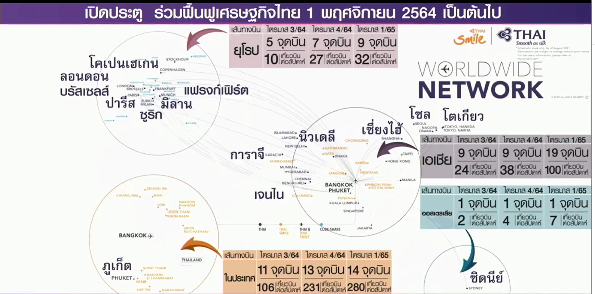 นอกจากนี้ เพื่อร่วมขับเคลื่อนการเปิดประเทศตามนโยบายรัฐบาล บริษัทฯ ได้ปรับเพิ่มเส้นทางบินที่ให้บริการเริ่มตั้งแต่วันที่ 31 ตุลาคม 2564 – 26 มีนาคม 2565 โดยภายในไตรมาสที่ 1/2565 จะมีเส้นทางบินในทวีปเอเชีย 19 จุดบิน ในทวีปยุโรป 9 จุดบิน ในทวีปออสเตรเลีย 1 จุดบิน และภายในประเทศโดยสายการบินไทยสมายล์ 14 จุดบิน ด้วยบริการเต็มรูปแบบ (Full Services)
