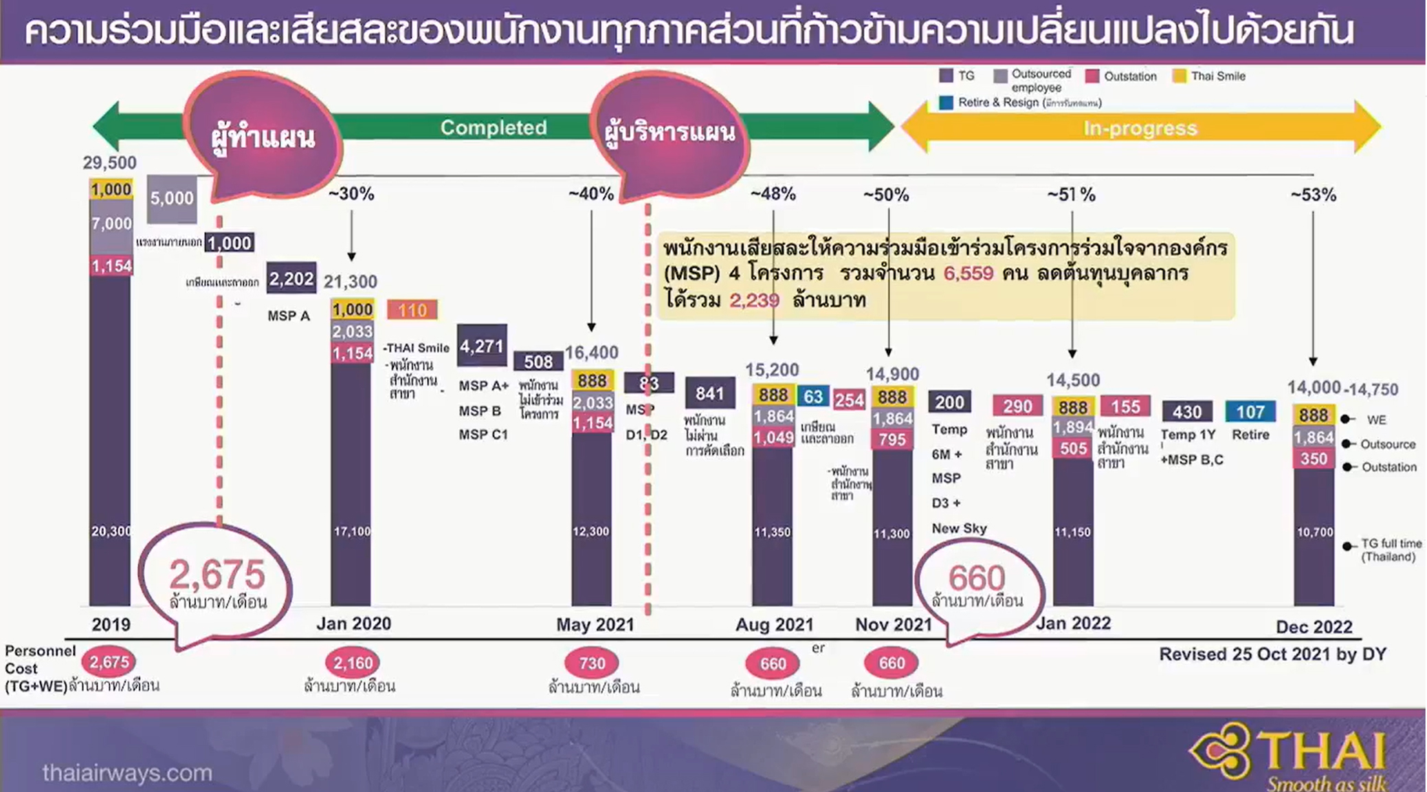 ทำให้ปัจจุบัน บริษัทฯ มีพนักงานทั้งสิ้น 14,900 คน เทียบกับปี 2562 มีจำนวนบุคลากรรวมแรงงานภายนอกจำนวน 29,500 คน ส่งผลให้ค่าใช้จ่ายบุคลากรลดลงจากเดือนละกว่า 2,600 ล้านบาทต่อเดือน เหลือกว่า 600 ล้านบาทต่อเดือน จำนวนผู้บริหารทุกระดับลดลงในสัดส่วน 35% ส่งผลให้ประสิทธิภาพและความคล่องตัวในการทำงานสูงขึ้น