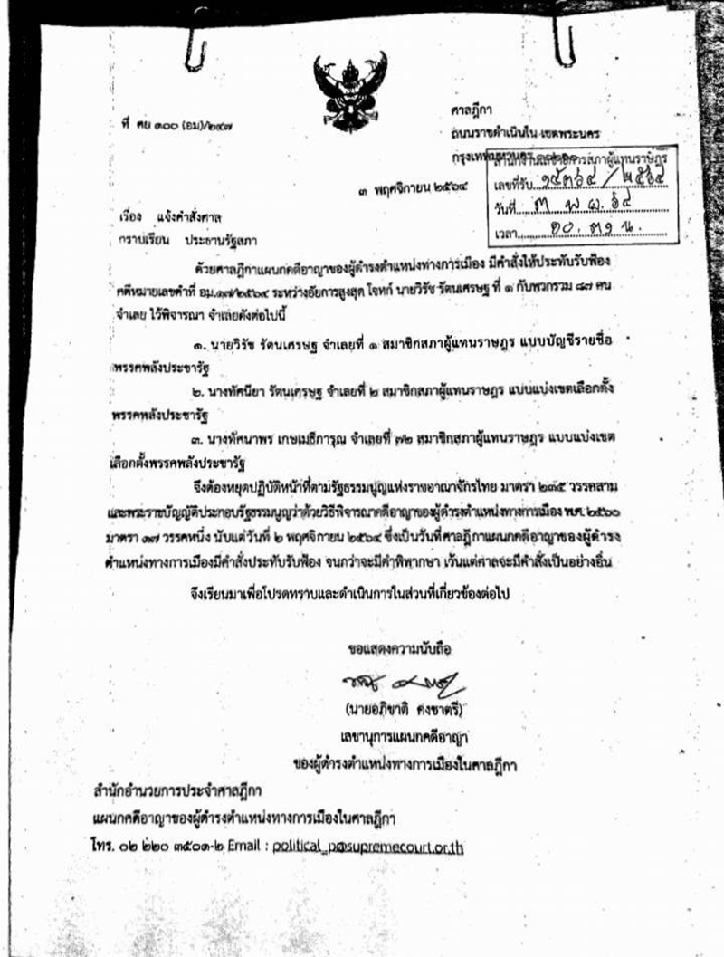 ผู้สื่อข่าวรายงานว่า เมื่อวันที่ 3 พฤศจิกายน 2564 เวลา 10.45 น. นายชวน หลีกภัย ประธานสภาผู้แทนราษฎร แจ้งก่อนเข้าสู่ระเบียบวาระการประชุมว่า ด้วยศาลฎีกาแผนกคดีอาญาของผู้ดำรงตำแหน่งทางการเมือง มีคำสั่งให้ประทับรับฟ้องคตดีหมายเลขดำที่ อม.17/2564 มีผลทำให้ 3 ส.ส.พรรคพลังประชารัฐ ประกอบด้วย นายวิรัช รัตนเศรษฐ ส.ส.บัญชีรายชื่อ , นางทัศนียา รัตนเศรษฐ และนางทัศนาพร เกษเมธีการุณ ส.ส.นครราชสีมา ต้องหยุดปฏิบัติหน้าที่จนกว่าจะมีคำพิพากษาตามมาตรา 235 วรรคสาม แห่งรัฐธรรมนูญ พ.ศ.2560 และมาตรา 17 วรรคหนึ่ง ของ พ.ร.ป.ว่าด้วยวิธีพิจารณาคดีอาญาของผู้ดำรงตำแหน่งทางการเมือง พ.ศ.2560 นับตั้งแต่วันที่ 2 พฤศจิกายน 2564 ซึ่งเป็นวันที่ศาลฎีกาแผนกคดีอาญาของผู้ดำรงตำแหน่งทงการเมืองมีคำสั่งประทับรับฟ้อง จนกว่าจะมีคำพิพากษา หรือเว้นแต่ศาลจะคำสั่งเป็นอย่างอื่น