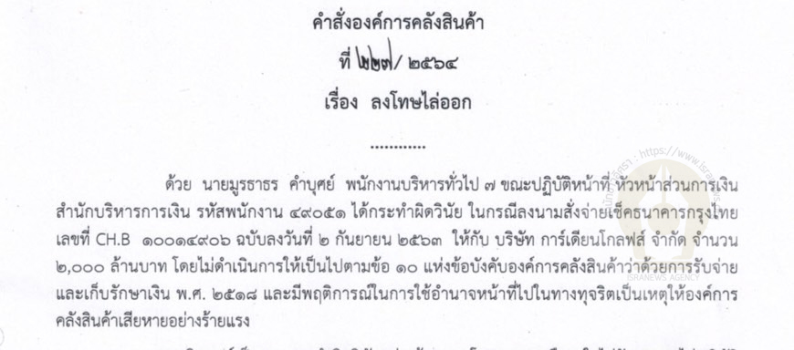 ส่วนคำสั่งลไล่ออก นายมูรธาธร คำบุศย์ ได้กระทำผิดวินัย ในกรณีลงนามสั่งจ่ายเช็คธนาคารกรุงไทย ให้กับ บริษัท การ์เดียนโกลฟส์ จำกัด จำนวน 2,000 ล้านบาท โดยไม่ดำเนินการให้เป็นไปตามข้อ 10 แห่งข้อบังคับองค์การคลังสินค้าว่าด้วยการรับจ่ายและเก็บรักษาเงิน พ.ศ. 2518 และมีพฤติการณ์ในการใช้อำนาจหน้าที่ไปในทางทุจริตเป็นเหตุให้องค์การคลังสินค้าเสียหายอย่างร้ายแรง