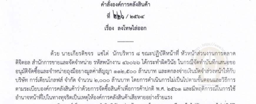ล่าสุด สำนักข่าวอิศรา ได้รับการยืนยันจากแหล่งข่าวกระทรวงพาณิชย์ ว่า เมื่อวันที่ 19 ตุลาคม 2564 ที่ผ่านมา นายเกรียงศักดิ์ ประทีปวิศรุต ผอ.อคส. ได้ลงนามในคำสั่งลงโทษไล่ออก นายเกียรติขจร แซ่ไต่ และนายมูรธาธร คำบุศย์ เป็นทางการแล้ว โดยให้มีผลตั้งแต่วันที่ 12 ตุลาคม 2564 เป็นต้นไป