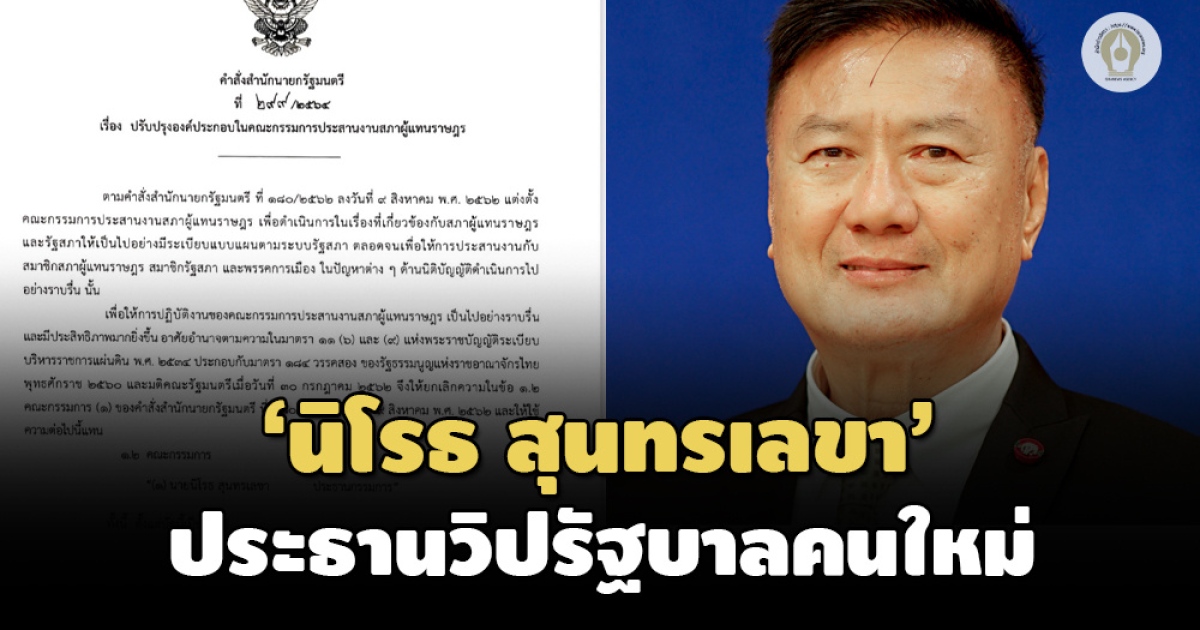 เพื่อให้การปฏิบัติงานของคณะกรรมการประสานงานสภาผู้แทนราษฎร เป็นไปอย่างราบรื่นและมีประสิทธิภาพมากยิ่งขึ้น อาศัยอำนาจตามความในมาตรา 11 (6) และ (8) แห่งพระราชบัญญัติระเบียบบริหารราชการแผ่นดิน พ.ศ. 2534 ประกอบกับมาตรา 184 วรรคสอง ของรัฐธรรมนูญแห่งราชอาณาจักรไทย พุทธศักราช 2560 และมติคณะรัฐมนตรีเมื่อวันที่ 30 กรกฎาคม 2562 จึงให้ยกเลิกความในข้อ 1.2 คณะกรรมการ (1) ของคำสั่งสำนักนายกรัฐมนตรี ที่ 180/2562 ลงวันที่ 9 สิงหาคม พ.ศ.2562 และให้ นายนิโรธ สุนทรเลขา ดำรงตำแหน่ง ประธานกรรมการ ทั้งนี้ ตั้งแต่บัดนี้เป็นต้นไป