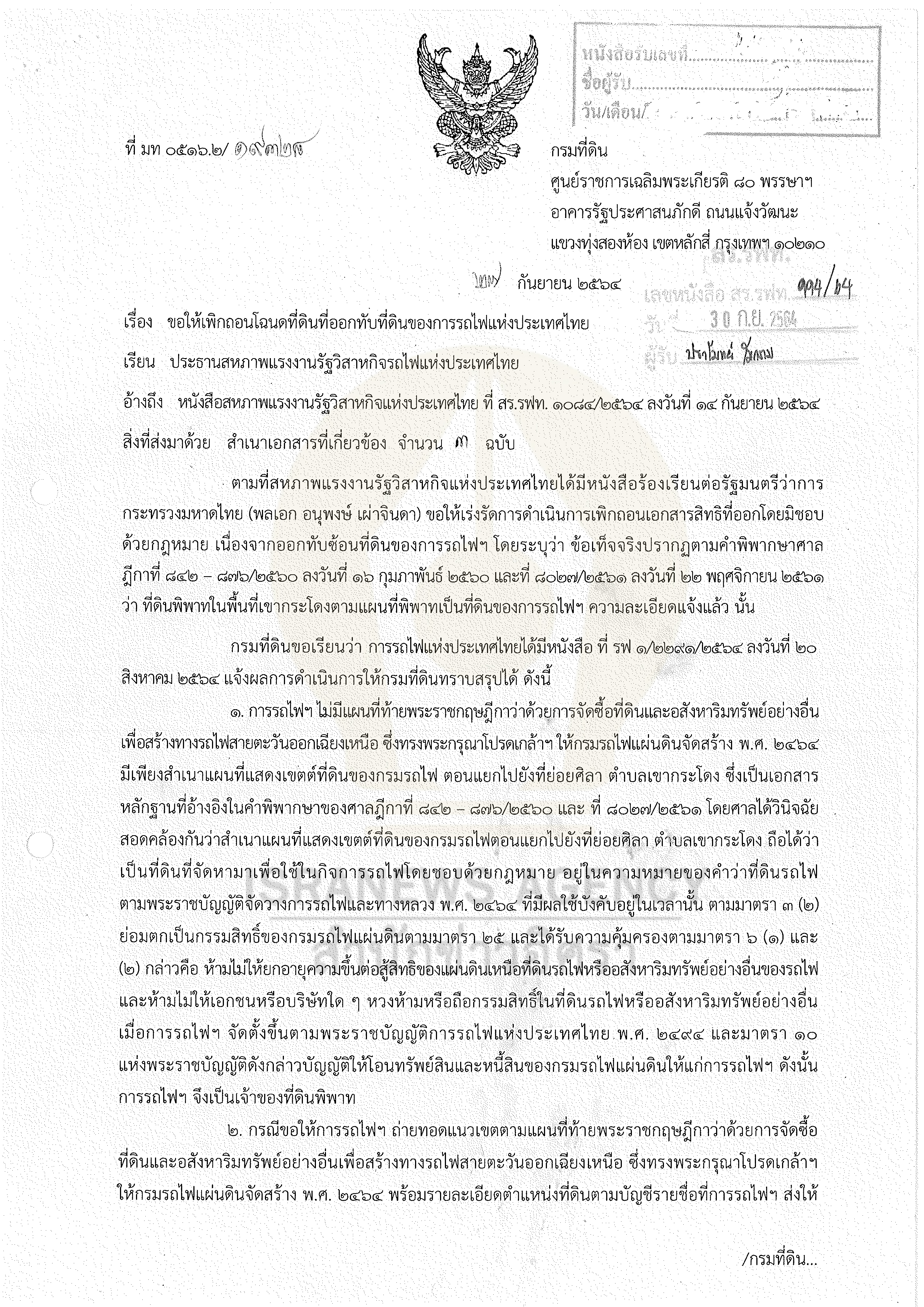 เมื่อวันที่ 6 พ.ย. สำนักข่าวอิศรา (www.isranews.org) รายงานว่า เมื่อวันที่ 30 ก.ย.2564 กรมที่ดิน โดยนายอำนวย พิณสุวรรณ ผู้อำนวยการสำนักมาตรฐานการออกหนังสือสำคัญ ปฏิบัติราชการแทนอธิบดีกรมที่ดิน ทำหนังสือที่ มท 0516.2/19328 ลงวันที่ 27 ก.ย.2564 ไปยังประธาน สร.รฟท. แจ้งผลดำเนินการของกรมที่ดิน กรณีที่ รฟท.ขอให้เพิกถอนโฉนดที่ดินที่ออกทับที่ดินของการรถไฟแห่งประเทศไทย