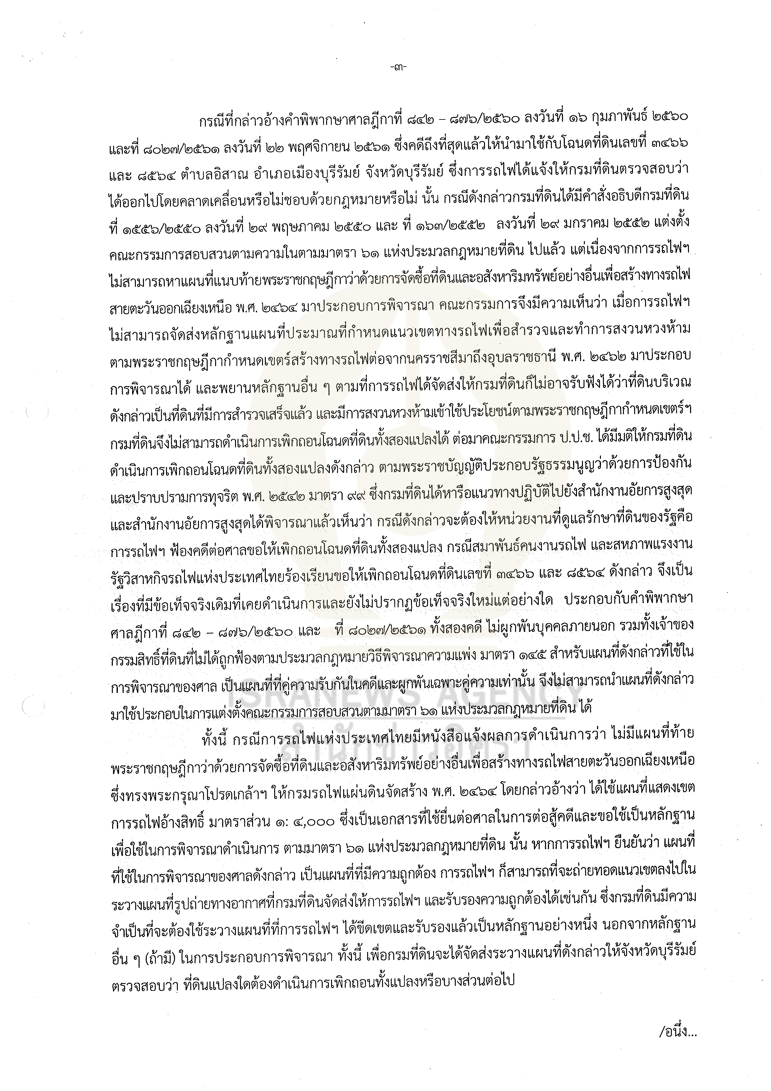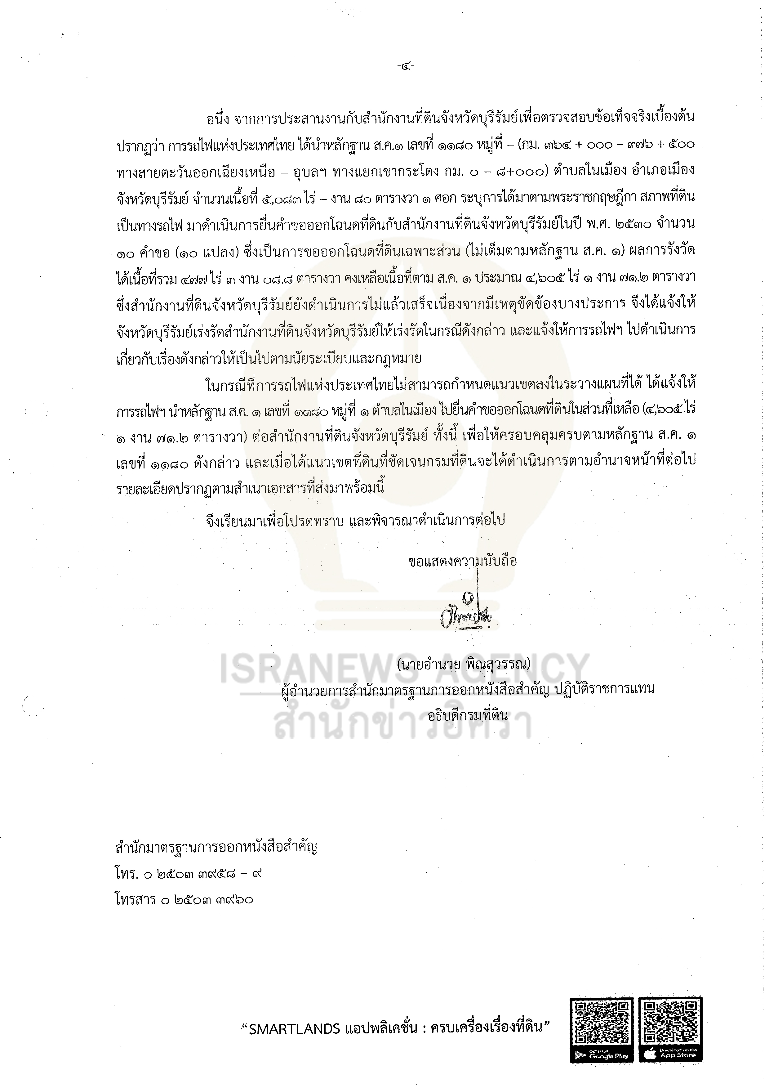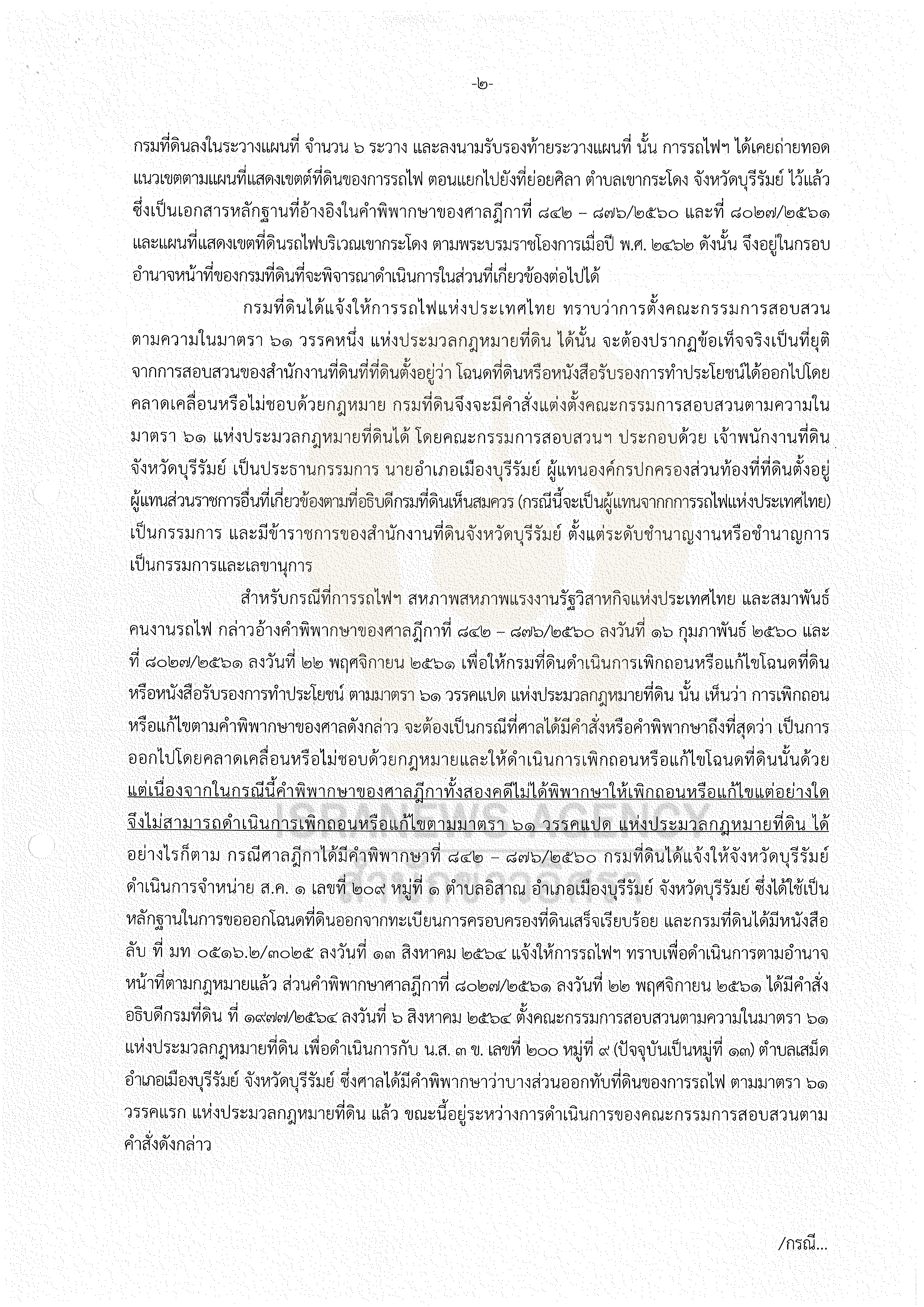 กรมที่ดิน จึงได้แจ้งให้จังหวัดบุรีรัมย์เร่งรัดสำนักงานที่ดินจังหวัดบุรีรัมย์เร่งรัดในกรณีดังกล่าว และแจ้งให้การรถไฟฯ ไปดำเนินการเกี่ยวกับเรื่องดังกล่าวให้เป็นไปตามนัยระเบียบและกฎหมาย