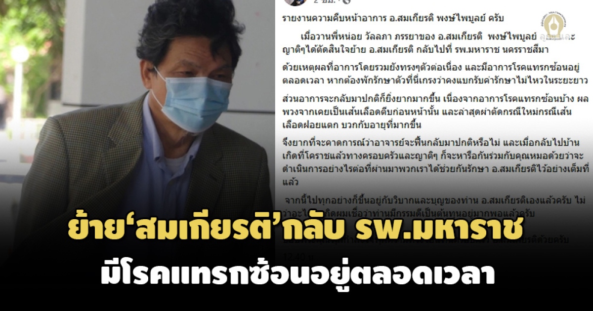 ‘สุริยะใส’ อัปเดตอาการ ‘สมเกียรติ พงษ์ไพบูลย์’ ภรรยาตัดสินใจย้ายกลับไปรักษาที่ รพ.มหาราช จ.นครราชสีมา ระบุ อาการโดยรวมยังทรงๆ แต่มีโรคแทรกซ้อนตลอดเวลา ยากที่จะคาดการณ์ว่าจะฟื้นกลับมาปกติหรือไม่
