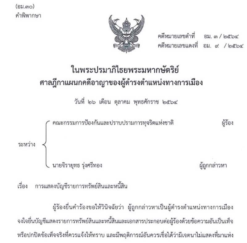 คดีระหว่างคณะกรรมการป้องกันและปราบปรามการทุจริตแห่งชาติ ผู้ร้อง นายจิรายุทธ ศรีทองรุ่ง ผู้ถูกกล่าวหา เรื่องการแสดงบัญชีรายการทรัพย์สินและหนี้สิน