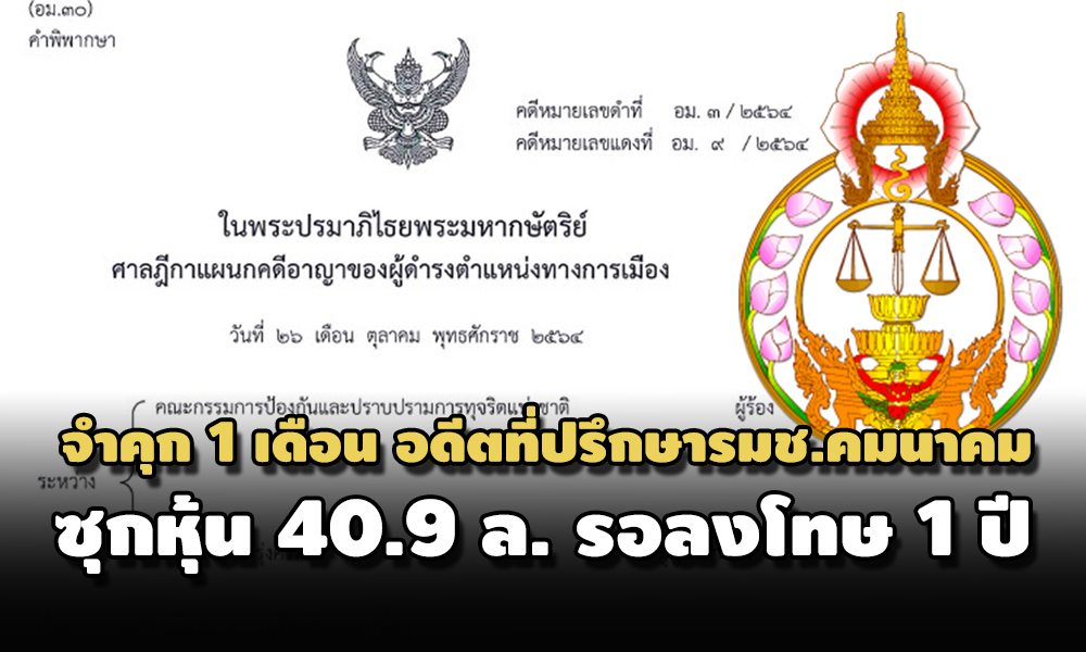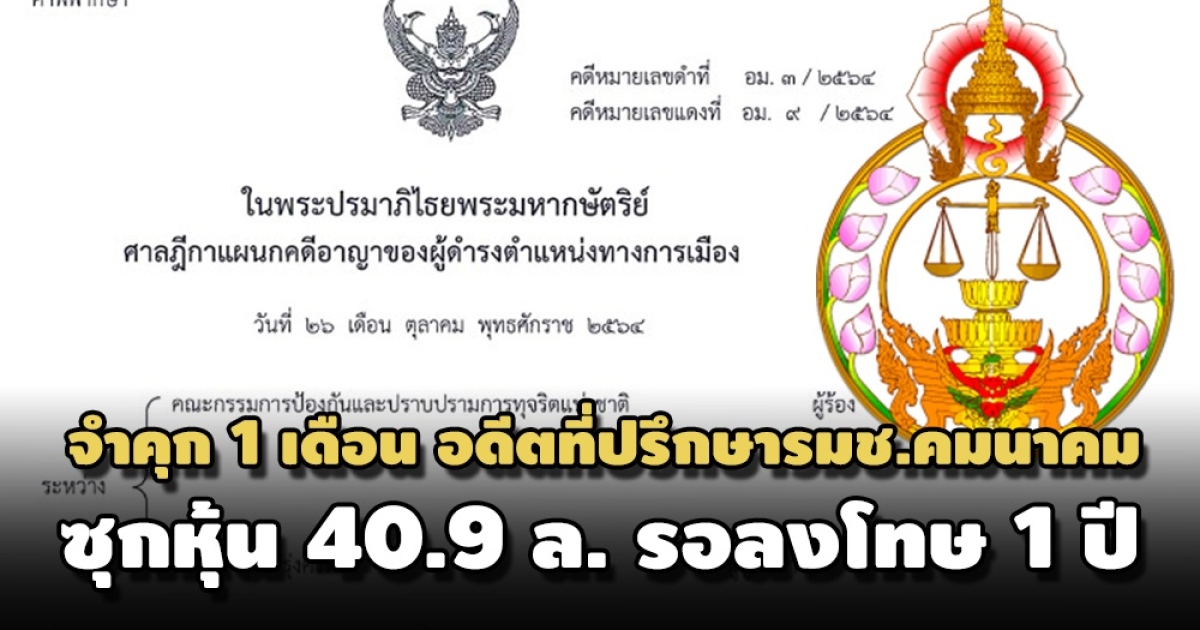 ศาลฎีกาฯพิพากษาจําคุก 1 เดือน ปรับ 4,000 บาท ‘จิรายุทธ รุ่งศรีทอง’ ยื่นบัญชีทรัพย์สินเท็จ ป.ป.ช. กรณีพ้นตำแหน่ง ที่ปรึกษารมช.คมนาคม ไม่แสดงเงินลงทุนหุ้น 2 บริษัท มูลค่า 40.9 ล้าน ห้ามดํารงตําแหน่งทางการเมือง 5 ปี โทษจำคุกรอลงโทษ 1 ปี