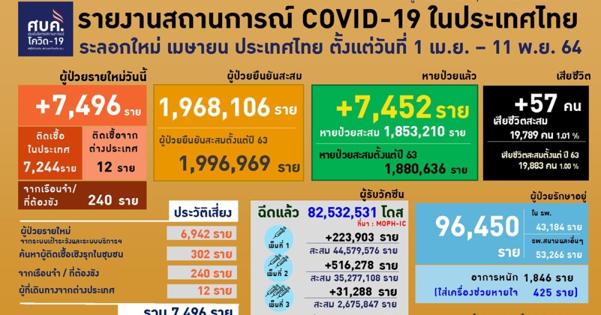 สำนักข่าวอิศรา (www.isranews.org) รายงานว่า เมื่อวันที่ 11 พ.ย. 2564 ศูนย์บริหารสถาการณ์โควิด-19 (ศบค.) รายงานสถานการณ์ประจำวัน โดยพบผู้ป่วยรายใหม่ 7,496 ราย จำแนกเป็น ติดเชื้อในประเทศ 7,244 ราย เกิดจากระบบเฝ้าระวังและระบบบริการฯ 6,942 ราย เกิดจากการค้นหาเชิงรุกและพบการติดเชื้อในชุมชน 302 ราย ติดเชื้อภายในเรือนจำ 240 ราย อีก 12 รายเดินทางกลับมาจากต่างประเทศ รวมผู้ป่วยสะสม 1,996,969 ราย