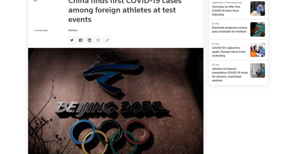 สำนักข่าวอิศรา (www.isranews.org) รายงานสถานการณ์เกี่ยวข้องกับการระบาดของไวรัสโควิด-19 หรือโคโรน่าไวรัสว่าประเทศจีนนั้นพบเจอการระบาดของไวรัสโควิด 19 ในกลุ่มนักกีฬาต่างชาติจำนวน 2 รายซึ่งจะเข้าร่วมการแข่งขันกีฬาโอลิมปิกฤดูหนาว ณ กรุงปักกิ่ง วันที่ 4-20 ก.พ. 2565 ซึ่งการตรวพบดังกล่าวเป็นหนึ่งในมาตรการเชิงรุกของประเทศจีนที่จะดำเนินการควบคุมการแพร่ระบาดของไวรัส