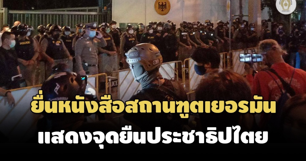 จากนั้นเวลา 18.30 น.บริเวณหน้าสถานทูตเยอรมนี ย่านสาทร กลุ่มผู้ชุมนุมได้เดินทางมาถึงหน้าสถานทูตฯ ท่ามกลางตำรวจที่ตั้งแนวป้องกันไว้อย่างแน่นหนาหน้าประตูสถานทูตฯ จากนั้นตัวแทนผู้ชุมนุม อ่านแถลงการณ์ มีเนื้อหาตอนหนึ่งระบุว่า นี่ไม่ใช่การเคลื่อนไหวเพื่อไล่นายกฯ นี่ไม่ใช่การเคลื่อนไหวเพื่อยกเลิกมาตรา 112 นี่ไม่ใช่การเคลื่อนไหวเพื่อปฏิรูปฯ นี่ไม่ใช่การเคลื่อนไหวเพื่อล้มล้างฯ แต่คือการเคลื่อนไหวเพื่อต่อต้านระบอบสมบูรณาญาสิทธิราชย์ นี่คือการต่อสู้เพื่อยืนยันว่าประเทศนี้ต้องปกครองโดยระบอบที่คนทุกคนเสมอหน้าเท่าเทียมกัน นี่คือการต่อต้านระบอบสมบูรณาญาสิทธิราชย์ เพื่อปกป้องระบอบประชาธิปไตย