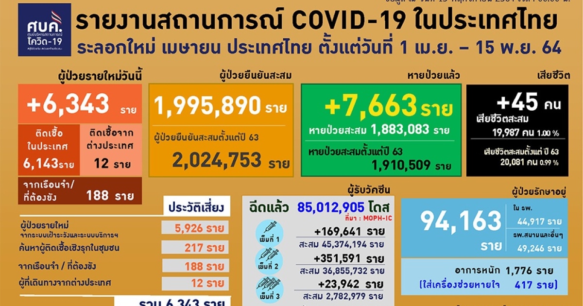 สำนักข่าวอิศรา (www.isranews.org) รายงานว่า เมื่อวันที่ 15 พ.ย.2564 เวลา 12.30 น. นพ.ทวีศิลป์ วิษณุโยธิน โฆษกศูนย์บริหารสถานการณ์โควิด (ศบค.) รายงานสถานการณ์การระบาดประจำวันเพิ่มเติมว่า จากจำนวนผู้ติดเชื้อรายใหม่ 6,343 ราย และมีผู้เสียชีวิต 45 ราย โดยเป็นผู้สูงอายุ 31 ราย คิดเป็น 69% และผู้ป่วย 7 กลุ่มโรคเรื้อรัง 12 ราย คิดเป็น 27% ซึ่งหากรวมกันพบมีอัตราการเสียชีวิตสูงถึง 96% และมีปัจจัยเสี่ยงต่อการติดเชื้อ มาจากในครอบครัว คนรู้จัก และอาศัยในพื้นที่ระบาด