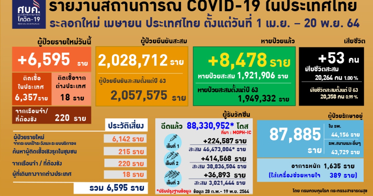 สำนักข่าวอิศรา (www.isranews.org) รายงานว่า เมื่อวันที่ 20 พ.ย. 2564 ศูนย์บริหารสถาการณ์โควิด-19 (ศบค.) รายงานสถานการณ์ประจำวัน โดยพบผู้ป่วยรายใหม่ 6,595 ราย จำแนกเป็น ติดเชื้อในประเทศ 6,357 ราย เกิดจากระบบเฝ้าระวังและระบบบริการฯ 6,142 ราย เกิดจากการค้นหาเชิงรุกและพบการติดเชื้อในชุมชน 215 ราย ติดเชื้อภายในเรือนจำ 220 ราย อีก 18 รายเดินทางกลับมาจากต่างประเทศ รวมผู้ป่วยสะสม 2,057,575 ราย