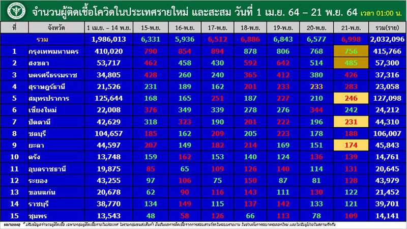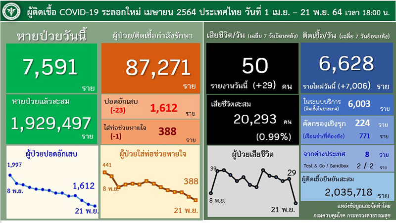 อนึ่งเมื่อเวลา 07.27น. สำนักข่าวอิศรา รายงานว่า สถานการณ์โควิดประจำวัน 21 พ.ย. 2564 พบผู้ป่วยรายใหม่ 7,006 ราย จำแนกเป็น ติดเชื้อในประเทศ 6,998 ราย เกิดจากระบบเฝ้าระวังและระบบบริการฯ 6,003 ราย เกิดจากการค้นหาเชิงรุกและพบการติดเชื้อในชุมชน 224 ราย ติดเชื้อภายในเรือนจำ 771 ราย อีก 8 รายเดินทางกลับมาจากต่างประเทศ ทำให้มีผู้ป่วยสะสมตั้งแต่ 1 เม.ย.จนถึงปัจจุบัน 2,035,718 ราย
