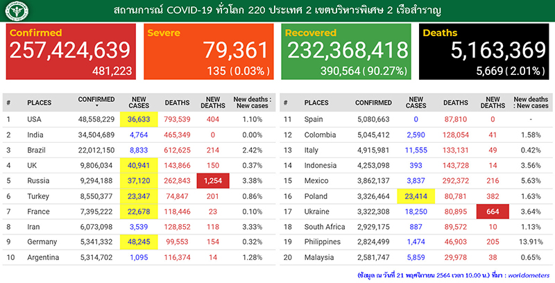 ขณะที่สถานการณ์ทั่วโลกพบผู้ป่วยเพิ่ม 481,223 ราย รวม 257,424,639 ราย อาการหนัก 79,361 ราย หายป่วย 232,368,418 ราย เสียชีวิต 5,163,396 ราย โดยสหรัฐอเมริกาพบผู้ป่วยเพิ่ม 36,633 ราย รวม 48,558,229 ราย เสียชีวิตเพิ่ม 404 ราย รวม 793,539 ราย อินเดีย พบเพิ่ม 4,764 ราย รวม 34,504,689 ราย ไม่มีผู้เสียชีวิตเพิ่ม รวม 465,349 ราย บราซิล พบเพิ่ม 8,833 ราย รวม 22,012,150 ราย เสียชีวิตเพิ่ม 214 ราย รวม 612,625 ราย ส่วนไทยอยู่ในอันดับที่ 24 ของโลก