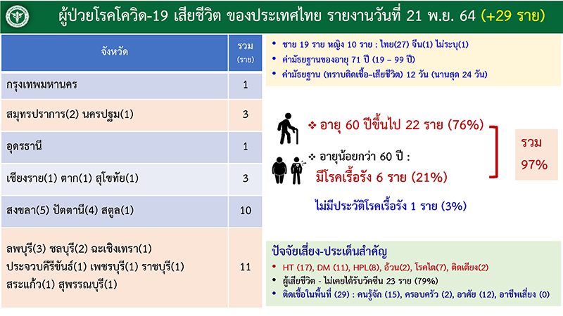สำหรับผู้เสียชีวิต 29 ราย มาจาก กทม. 1 ราย ปริมณฑล 3 ราย ภาคตะวันออกเฉียงเหนือ 1 ราย ภาคเหนือ 3 ราย ภาคใต้ 10 ราย และภาคกลาง 11 ราย แบ่งเป็นชาย 19 ราย หญิง 10 ราย อายุระหว่าง 19-99 ปี โดยปัจจัยเสี่ยงต่อความรุนแรงของโรค ส่วนใหญ่มีโรคประจำตัว ความดันโลหิตสูง เบาหวาน โรคไต โรคอ้วน ติดเตียง ส่วนปัจจัยเสี่ยงสูงสุดมาจาติดเชื้อจากคนรู้จัก ครอบครัว เพื่อน อาศัยในพื้นที่ระบาด และประกอบอาชีพเสี่ยง