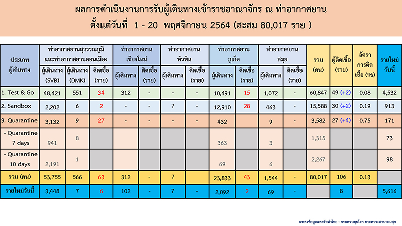 ส่วนรายงานการเดินทางเข้ามาในราชอาณาจักร ตั้งแต่ 1 พ.ย. 2564 มีผู้เดินทางเข้าประเทศรายใหม่ 5,616 ราย รวมสะสม 80,017 ราย จำแนกเป็น Test and Go 60,847 ราย Sandbox 15,588 ราย กักตัว 7 วัน 1,315 ราย และ กักตัว 10 วัน 2,267 ราย ติดเชื้อใหม่ 8 ราย รวมสะสม 106 ราย คิดเป็นอัตราการติดเชื้อ 0.13%