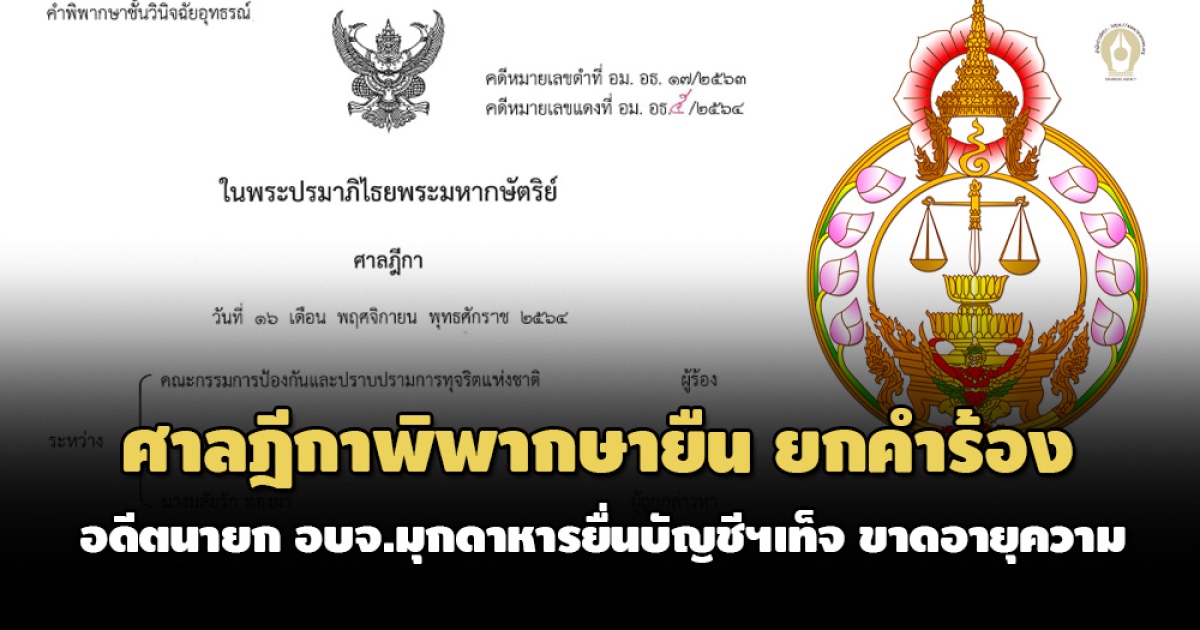 องค์คณะวินิจฉัยอุทธรณ์ศาลฎีกา พิพากษายืน ยกคำร้อง คดีอดีตนายก อบจ.มุกดาหาร จงใจยื่นบัญชีทรัพย์สินเท็จ ป.ป.ช. 2 ครั้ง ไม่แสดงที่ดิน มอเตอร์ไซค์ เงินเบิกเกินบัญชี สั่งเพิกถอนสิทธิสมัครรับเลือกตั้งกระทำมิได้ เหตุคดีขาดอายุความแล้ว สิทธินําคดีอาญามาฟ้องต้องถูกระงับ
