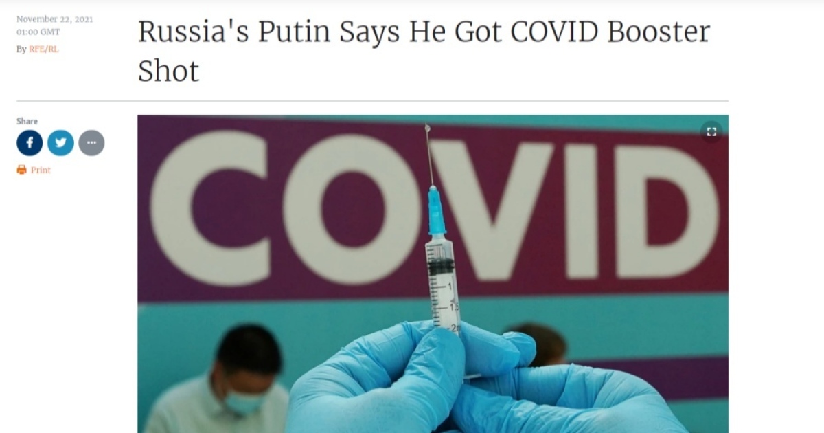 สำนักข่าวอิศรา (www.isranews.org) รายงานสถานการณ์เกี่ยวกับการระบาดของไวรัสโควิด-19 หรือโคโรน่าไวรัสว่า นายวลาดิเมียร์ ปูติน ประธานาธิบดีรัสเซียได้ออกมาเปิดเผยว่าตัวเขาได้เข้ารับการฉีดวัคซีนเข็มที่ 3 หรือที่เรียกว่าบูสเตอร์ชอตเมื่อวันที่ 21 พ.ย. ที่ผ่านมา