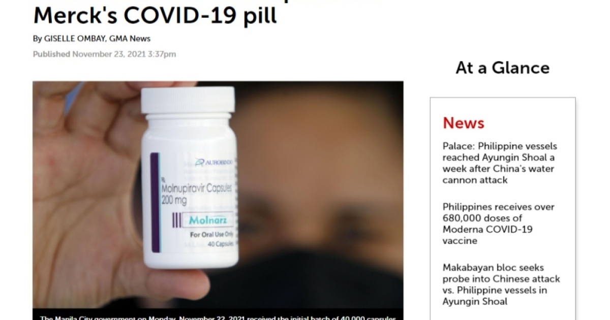 สำนักข่าวอิศรา (www.isranews.org) รายงานสถานการณ์เกี่ยวกับการระบาดของไวรัสโควิด-19 หรือโคโรน่าไวรัสว่า ที่ทำการกรุงมะนิลา ประเทศฟิลิปปินส์ได้เปิดเผยข้อมูลว่าเมื่อวันที่ 22 พ.ย.ที่ผ่านมา กรุงมะนิลาได้รับยาโมลนูพิราเวียร์ซึ่งเป็นยาทดลองสำหรับใช้รักษาผู้ป่วยโควิด-19 เป็นจำนวนกว่า 40,000 แคปซูลแล้ว