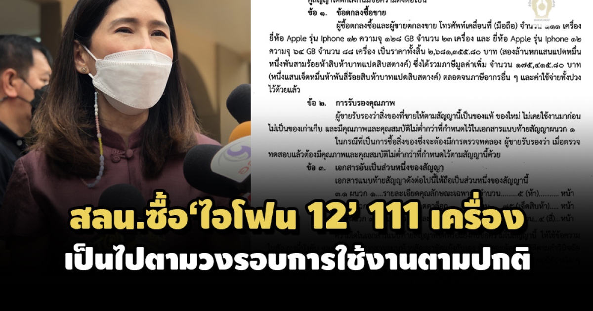 ‘ที่ปรึกษานายกฯ’ แจงปม สลน.จัดซื้อ ‘ไอโฟน 12’ จำนวน 111 เครื่อง 2.6 ล้านบาท เป็นตามวงรอบการใช้งานทุก 4 ปี ใช้สำหรับผู้บริหาร – ผอ.ทั้งข้าราชการประจำและการเมือง ยันจัดซื้อต่ำกว่าราคากลาง ส่วน ‘บิ๊กตู่’ สละสิทธิ์ไม่รับ