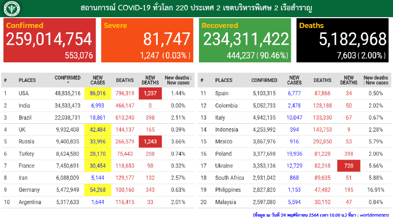 ขณะที่สถานการณ์ทั่วโลกพบผู้ป่วยเพิ่ม 553,076 ราย รวม 259,014,754 ราย อาการหนัก 81,747 ราย หายป่วย 234,311,422 ราย เสียชีวิต 5,182,968 ราย โดยสหรัฐอเมริกาพบผู้ป่วยเพิ่ม 86,016 ราย รวม 48,835,216 ราย เสียชีวิตเพิ่ม 1,237 ราย รวม 796,319 ราย อินเดีย พบเพิ่ม 6,993 ราย รวม 34,533,473 ราย เสียชีวิตเพิ่ม 0 ราย รวม 466,147 ราย บราซิล พบเพิ่ม 18,861 ราย รวม 22,038,731 ราย เสียชีวิตเพิ่ม 398 ราย รวม 613,240 ราย ส่วนไทยอยู่ในอันดับที่ 23 ของโลก